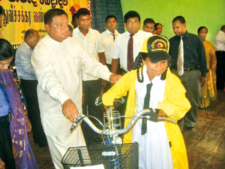 தேசிய போக்குவரத்துச் சபையினரால் மட்டக்களப்பு மாவட்டத்தில் போக்குவரத்து வசதியற்ற மாணவர்களுக்கு துவிச்சக்கர வண்டிகள் வழங்கப்பட்டன. இது தொடர்பான நிகழ்வு நேற்று ஆரையம்பதியில் நடந்தது. இதில் தனியார் போக்குவரத்து அமைச்சர் சி. பி. ரத்நாயக்க மாணவ, மாணவியருக்கான துவிச்சக்கர வண்டி யினை வழங்குகிறார். (தினகரன்).