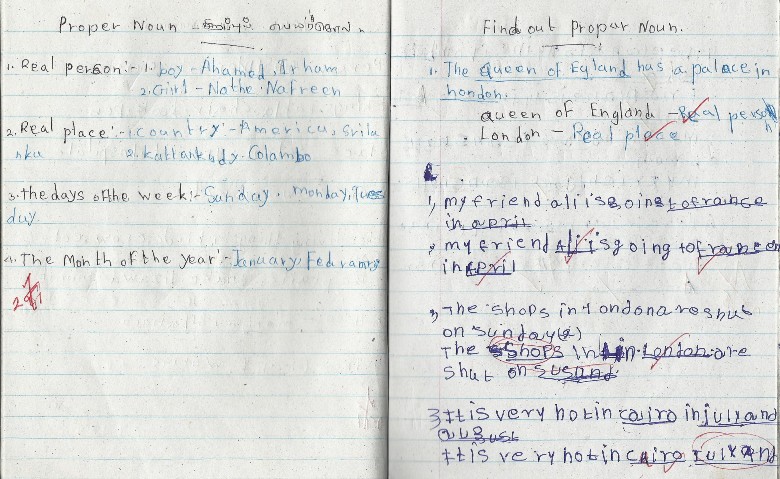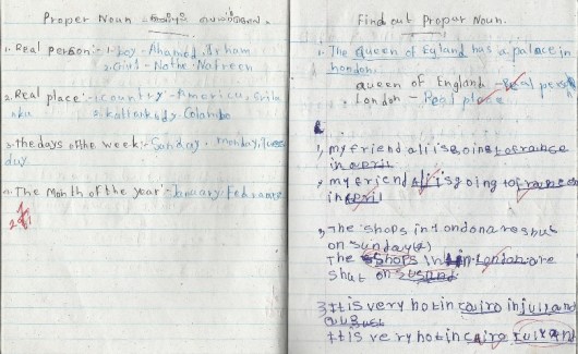 கடத்தப்பட்டதாகக் கூறப்படும் சிறுவன் ரஜிராம், மட்/அந்நாசர் வித்தியாலயத்தில் கல்வி பயிலும் போது, தன் கைப்பட எழுதிய அப்பியாசக் கொப்பிகளின் பிரதி.