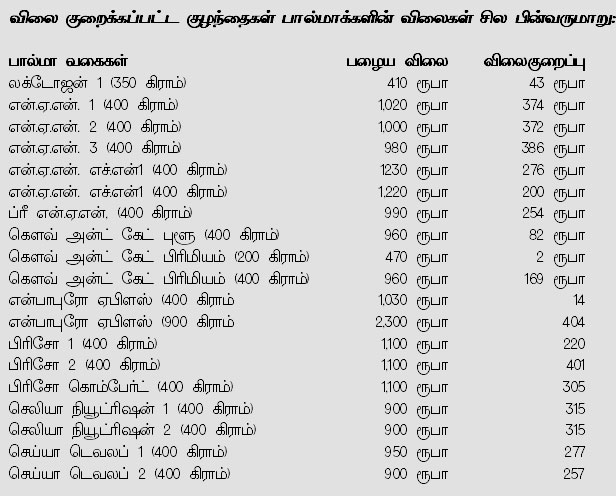 இதன்படி, குழந்தைகளுக்கான பால்மா பக்கற்றுக்கள் ஆகக் குறை ந்தது 2 ரூபாவாலும், ஆகக் கூடியது 404 ரூபாவாலும் குறைக்கப்பட்டு ள்ளன. இது தொடர்பான வர்த்த மானி அறிவித்தல் வெளியிடப்பட்டு ள்ளதாக கொழும்பில் நேற்று நடை பெற்ற ஊடகவியலாளர் சந்திப்பில் அமைச்சர் கூறினார்.