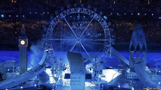 லண்டன் ஒலிம்பிக் மைதானத்தில் அரங்கு நிறைந்த 80,000 இரசிகர்களின் முன்னிலையில் ஒலிம்பிக் போட்டிகள் நிறைவடைந்தன. அதிசக்திவாய்ந்த டிஜிட்டல் தொழிநுட்பத்தைக் கையாண்டு லண்டன் அரங்கை வர்ணஜாலங்களால் அலங்கரித்திருந்தது ஓர் புதிய திருப்பமாக இருந்தது. ப
