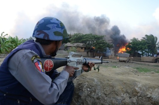 பர்மாவில் இடம்பெற்ற முஸ்லீம்கள் மீதான மதவெறித் தாக்குதலில் பௌத்த கலகக் காரர்களால் தீமூட்டப்பட்ட முஸ்லீம்களின் வீடுகள் எரியும் காட்சியை ஓர் பர்மிய பொலிஸ் வீரர் அவதானித்துக் கொண்டிருக்கும் காட்சி.