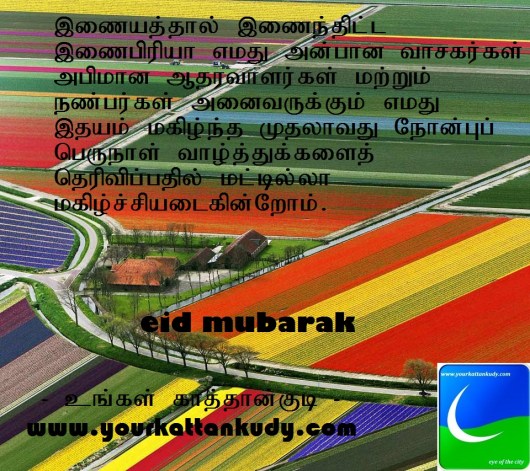 இணையங்களால் இணைந்து எமது வலைத்தளத்தில் கைகோர்த்து ஓரணியாக நிற்கும் எமது உள்ளுர் மற்றும் கடல்கடந்து வாழும் அன்பான வாசகர்கள், ஆதரவாளர்கள் மற்றும் நண்பர்கள் அனைவர்களுக்கும் எமது முதலாவது ‘ஈதுல் பித்ர்‘ நோன்புப் பெருநாள் நல்வாழ்த்துக்களை முதலில் தெரிவிப்பதில் மட்டில்லா மகிழ்ச்சியடைகின்றோம்.