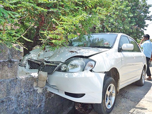 இறக்காமம் அல்-ஹுதா வீதியில் நேற்று (20) திங்கட்கிழமை சென்று கொண்டிருந்த கார் வேகத்தைக் கட்டுப்படுத்த முடி யாமல் வீட்டு மதில் மீது பாய்ந்து சேதத்துக்குள்ளாகியிருப்பதைக் காணலாம். (படம்: தினகரன்)