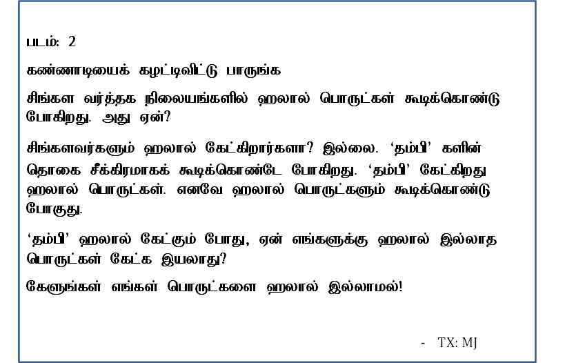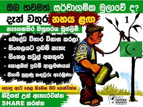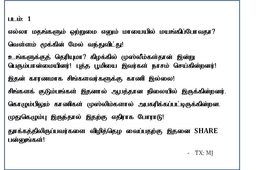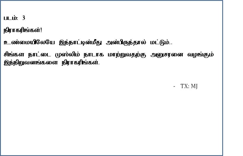 தற்பொழுது இலங்கையின் பேரினவாதக் குழுக்களால் முஸ்லிம்கள் மீது திட்டமிட்டு வெளியிடப்படும் இன உணர்வுகளைத் தூண்டும் புகைப்படங்கள், போஸ்டர்கள் தற்பொழுது முகநூலில் (Facebook) பற்பல விதங்களாக வெளிவந்துகொண்டிருக்கின்றன. சிங்களம் தெரியாத எமது சகோதரர்களுக்காக இதன் கருத்துக்களையும், இவர்களின் நோக்கங்களையும் தெரியப்படுத்தும் முகமாக இங்கு மொழியாக்கம் செய்யப்பட்டு பிரசுரிக்கப்படுகிறது.