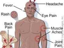 அவையாவன திடீரென அதிகரித்துச் செல்லும் மிகையான காய்ச்சல், தலைவலி, கண் பின்பகுதி வலி, உடல் வலி (தசை எலும்பு, வலி), களைப்பு, வாந்தி, குமட்டல், தொண்டைப்புண், சுவையில் மாற்றம், தோல் தடித்து சிவப்படைந்து சினைப்பு உண்டாதல், இவர்களுள் சிறிய பகுதியினர் (5%) நோய் கடுமையாகிக் காணப்படுவர். நோயரும்பு காலம்: நுளம்பு வைரஸை செலுத்தியதில் இருந்து அறிகுறிகள் தோற்றும் காலம் 3-14 நாட்களாகும்.