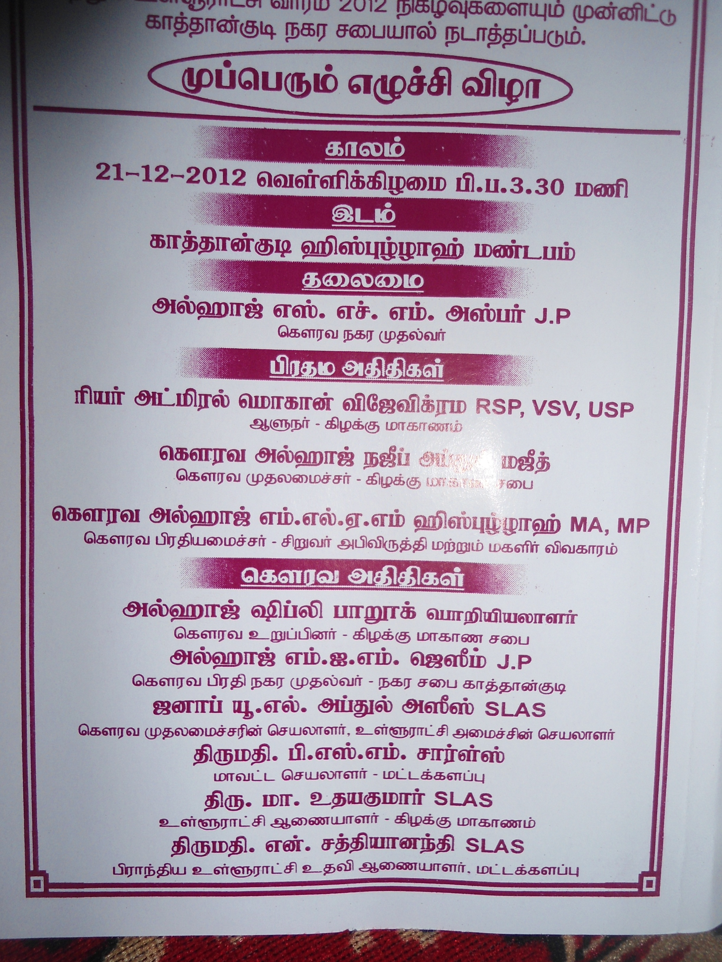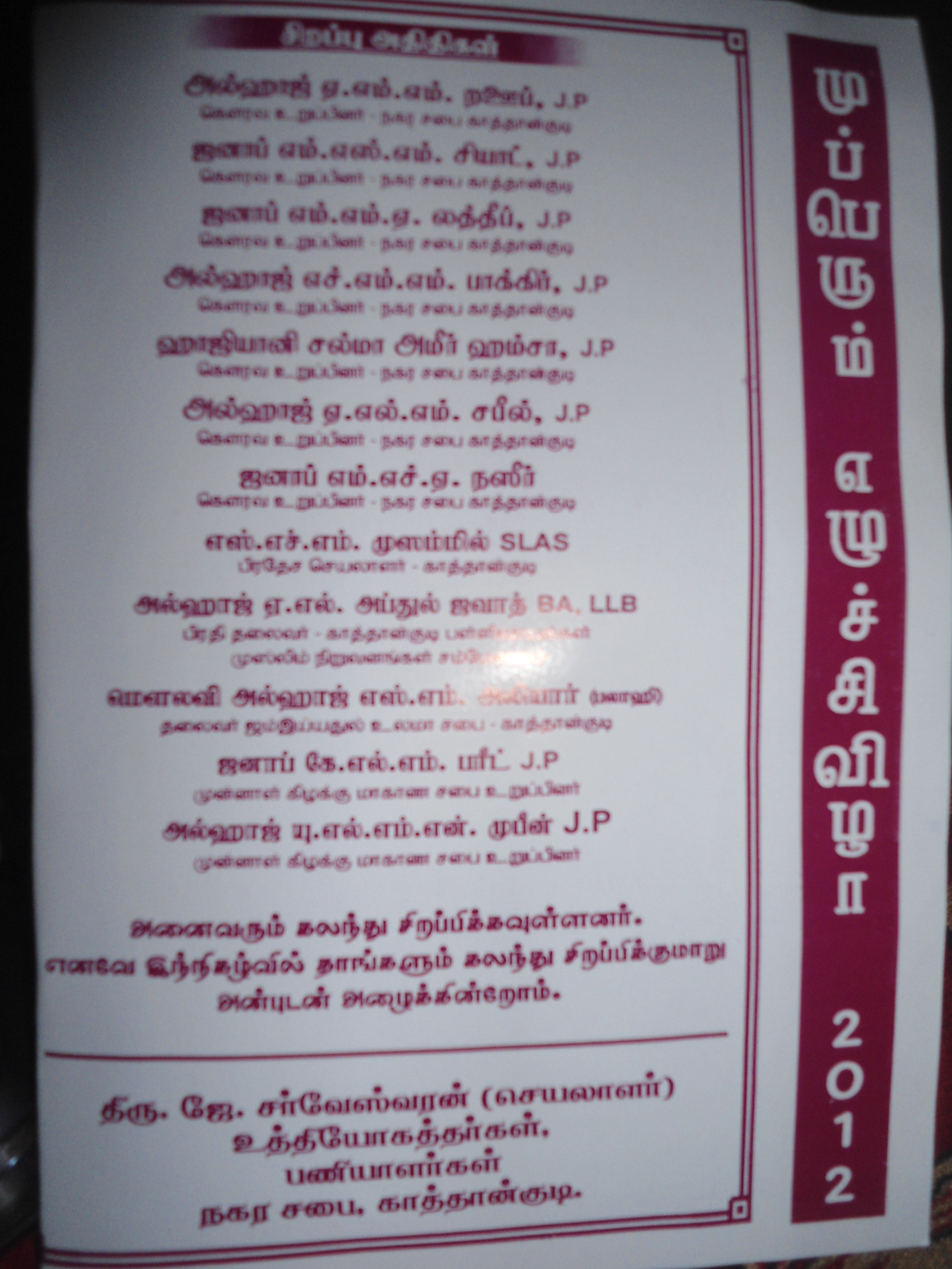 இடம் : காத்தான்குடி ஹிஸ்புழ்ழாஹ் மண்டபம்.