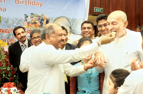 மேல்மாகாண ஆளுநர் அலவி மெளலானாவின் 81 ஆவது பிறந்த தினக் கொண்டாட்டத்தின் போது அமைச்சர் திணேஷ்குணவர்தன ஆளுநர் அலவிக்கு கேக் துண்டொன்றை ஊட்டுகின்றார்.