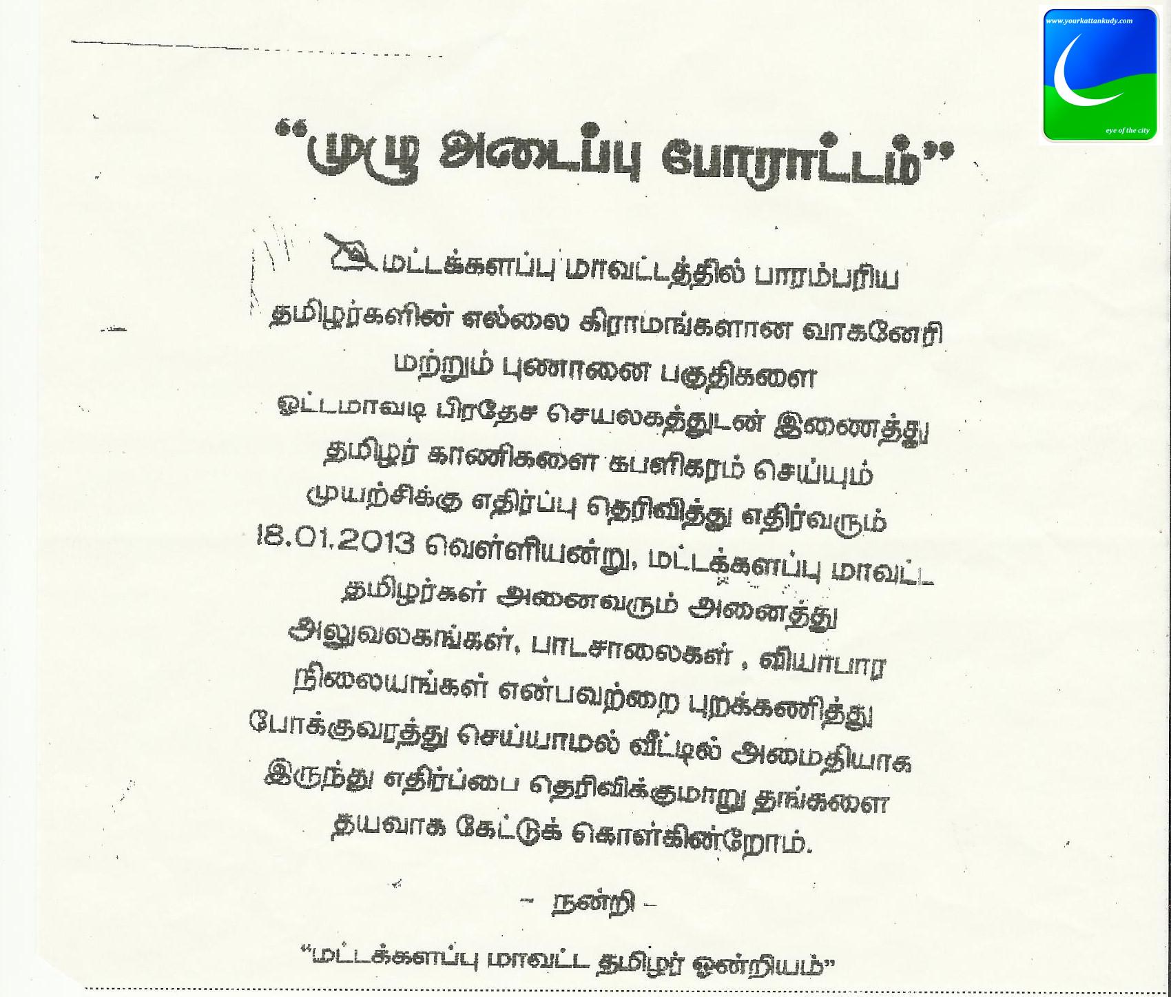 மட்டக்களப்பு மாவட்ட தமிழர்கள் அனைவரும் நாளை 18-01-2013 ஆம் திகதி வெள்ளிக்கிழமை அனைத்து அலுவலகங்கள் , பாடசாலைகள், வியாபார நிலையங்கள் என்பவற்றை புறக்கணித்து போக்குவரத்து செய்யாமல் வீட்டில் அமைதியாக இருந்து எதிர்ப்பை தெரிவிக்குமாறு மட்டக்களப்பு மாவட்ட தமிழர் ஒன்றியம் என்ற பெயரில் வியாழக்கிழமை இரவு மட்டக்களப்பு நகரில் துண்டுப்பிரசுரம் ஒன்று வெளியிடப்பட்டுள்ளது.