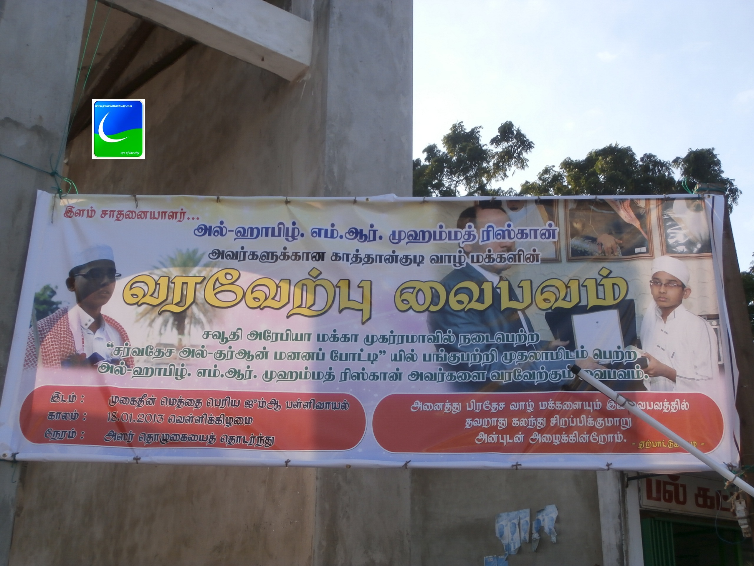சர்வதேச அல்குர்ஆன் மனனப் போட்டியில் முதலாமிடம் பெற்ற அல்ஹாபிழ் MR. முகம்மது றிஸ்கான் 18.01.2013 வெள்ளிக்கிழமை காத்தான்குடி சமூகத்தால் கௌரவிக்கப்பட்டார்.