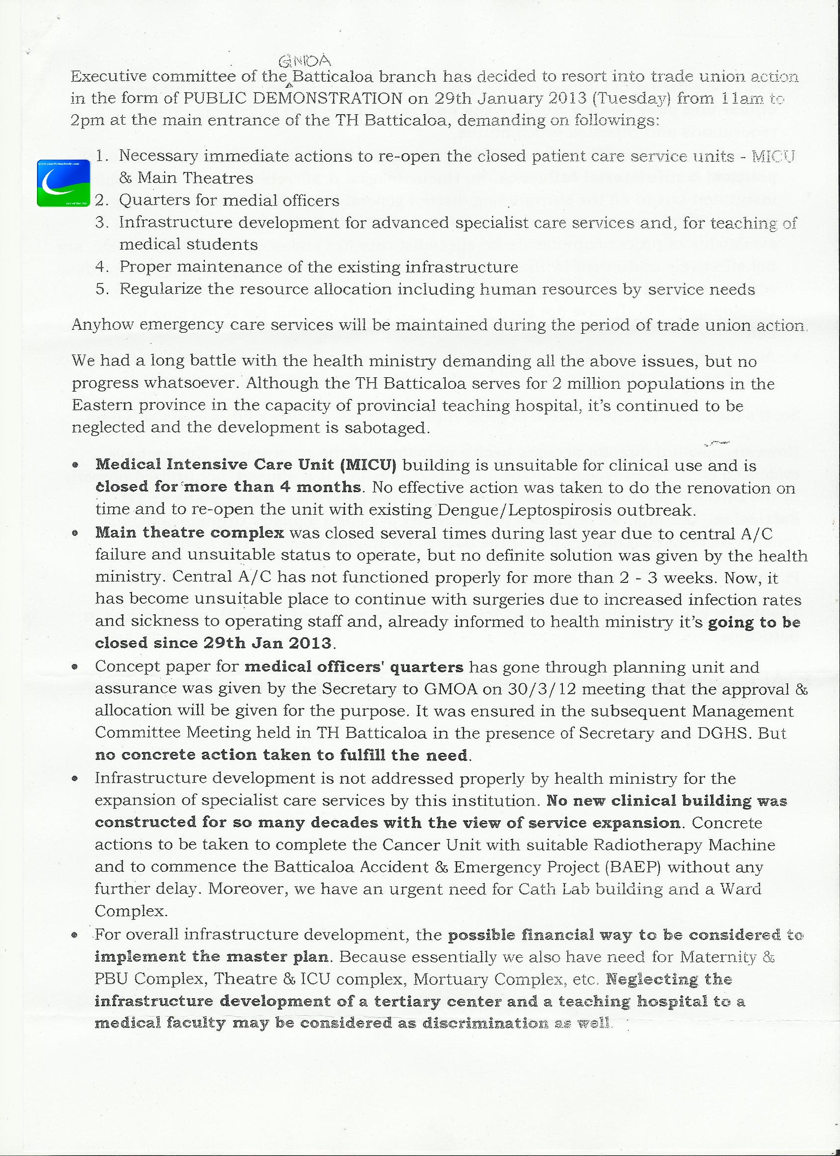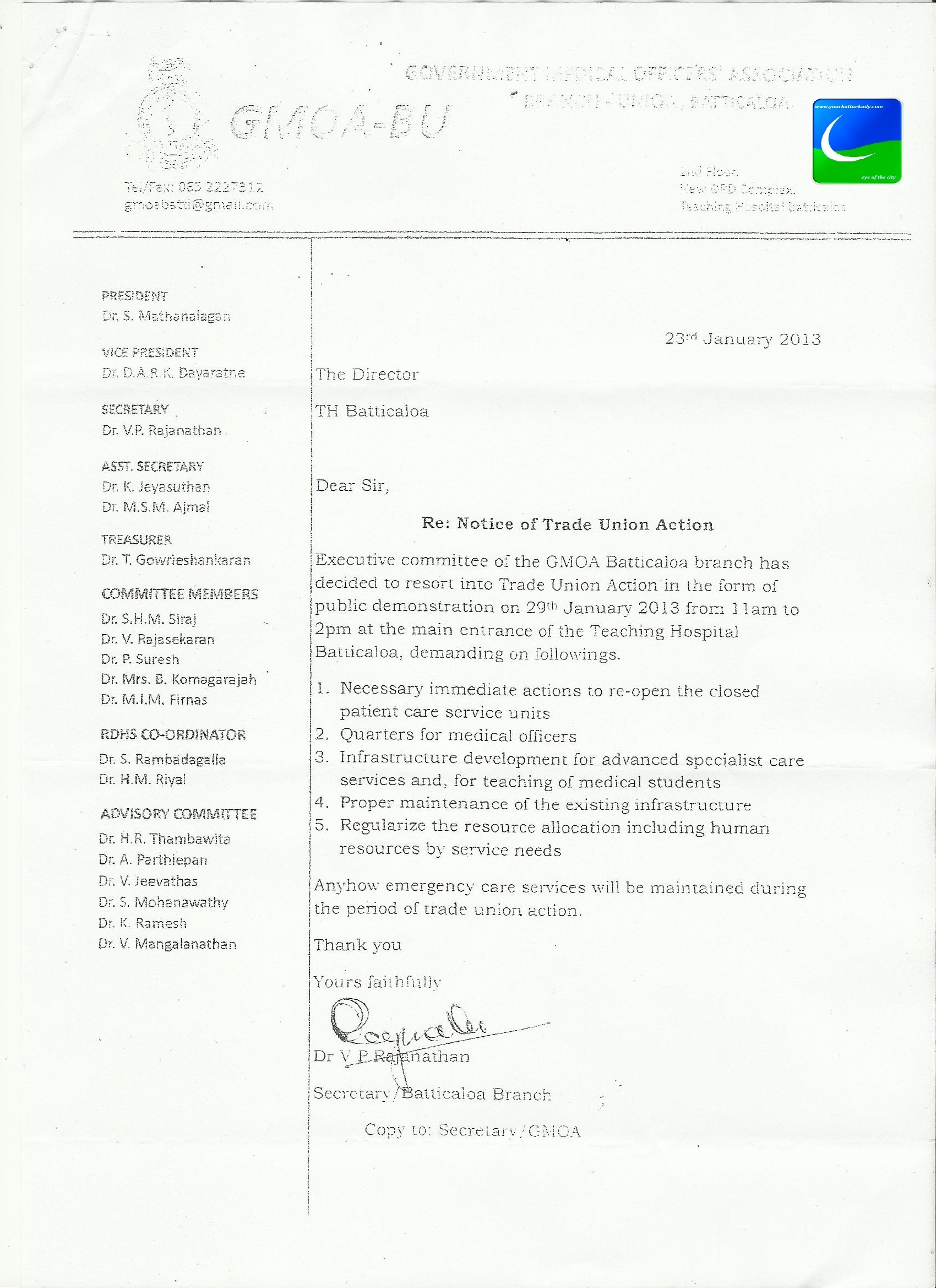 அரச மருத்துவர்கள் சங்க மட்டக்களப்பு கிளைத்; தொழிற்சங்கம் எதிர்வரும் செவ்வாய்க்கிழமை 2013-01-29ம் திகதி பொது எதிர்ப்பு ஆர்ப்பாட்டமொன்றில் ஈடுபடவுள்ளது.