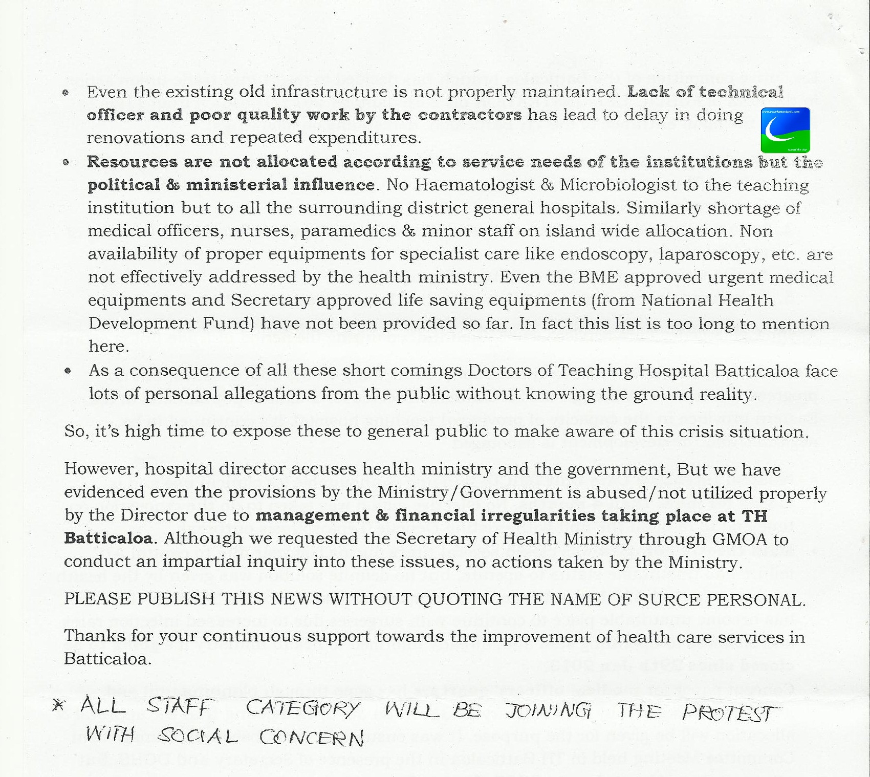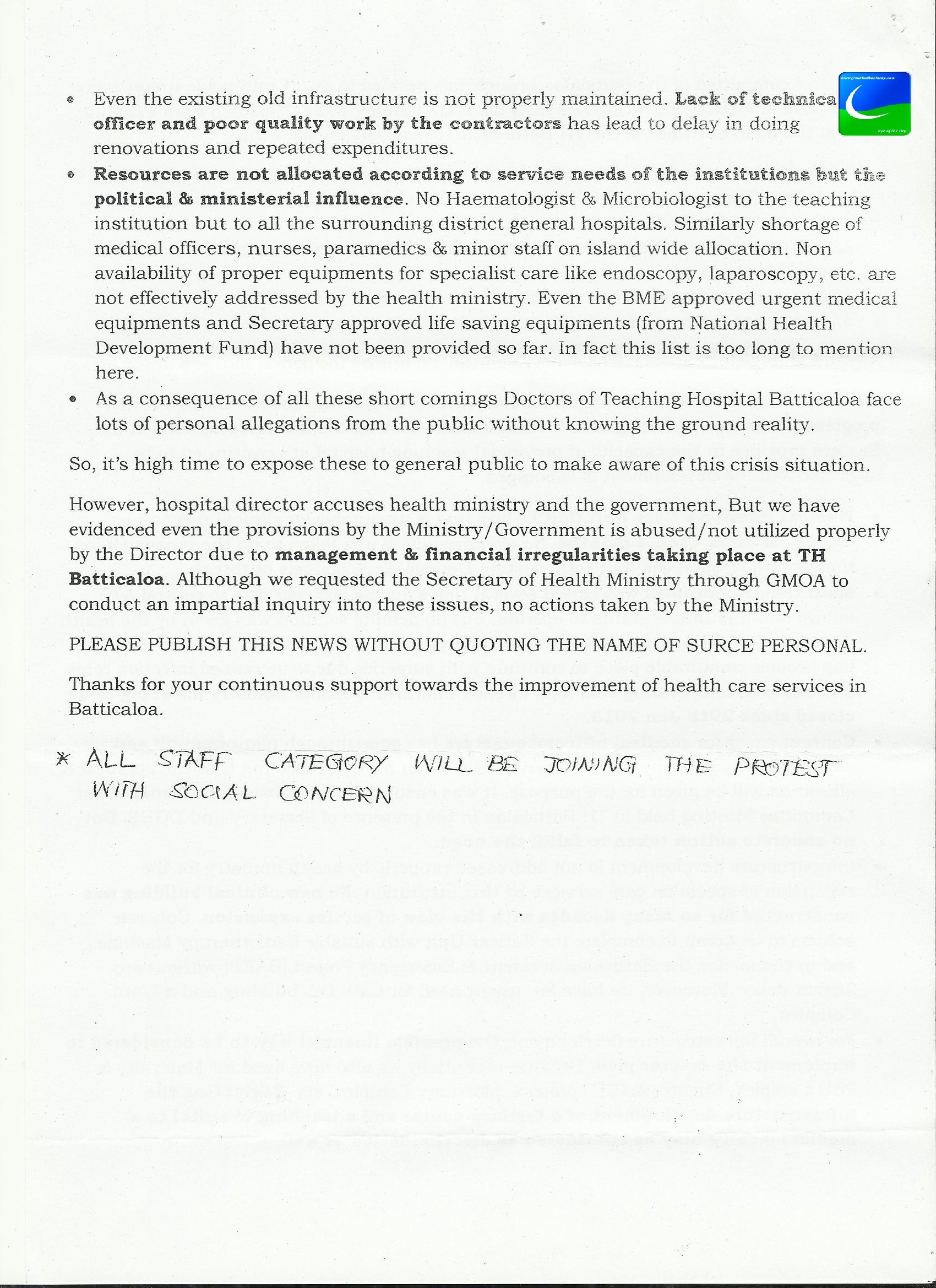 எமது வைத்தியசாலைப் பணிப்பாளர் சுகாதார அமைச்சினையும்,அரசாங்கத்தையும் குற்றம் சுமத்தினாலும் மட்டக்களப்பு போதனா வைத்தியசாலை இங்கு இடம்பெற்றுவரும் நிர்வாக மற்றும் நிதி ஒழுங்கினங்களைச் சுட்டிக்காட்டவேண்டியுள்ளது.