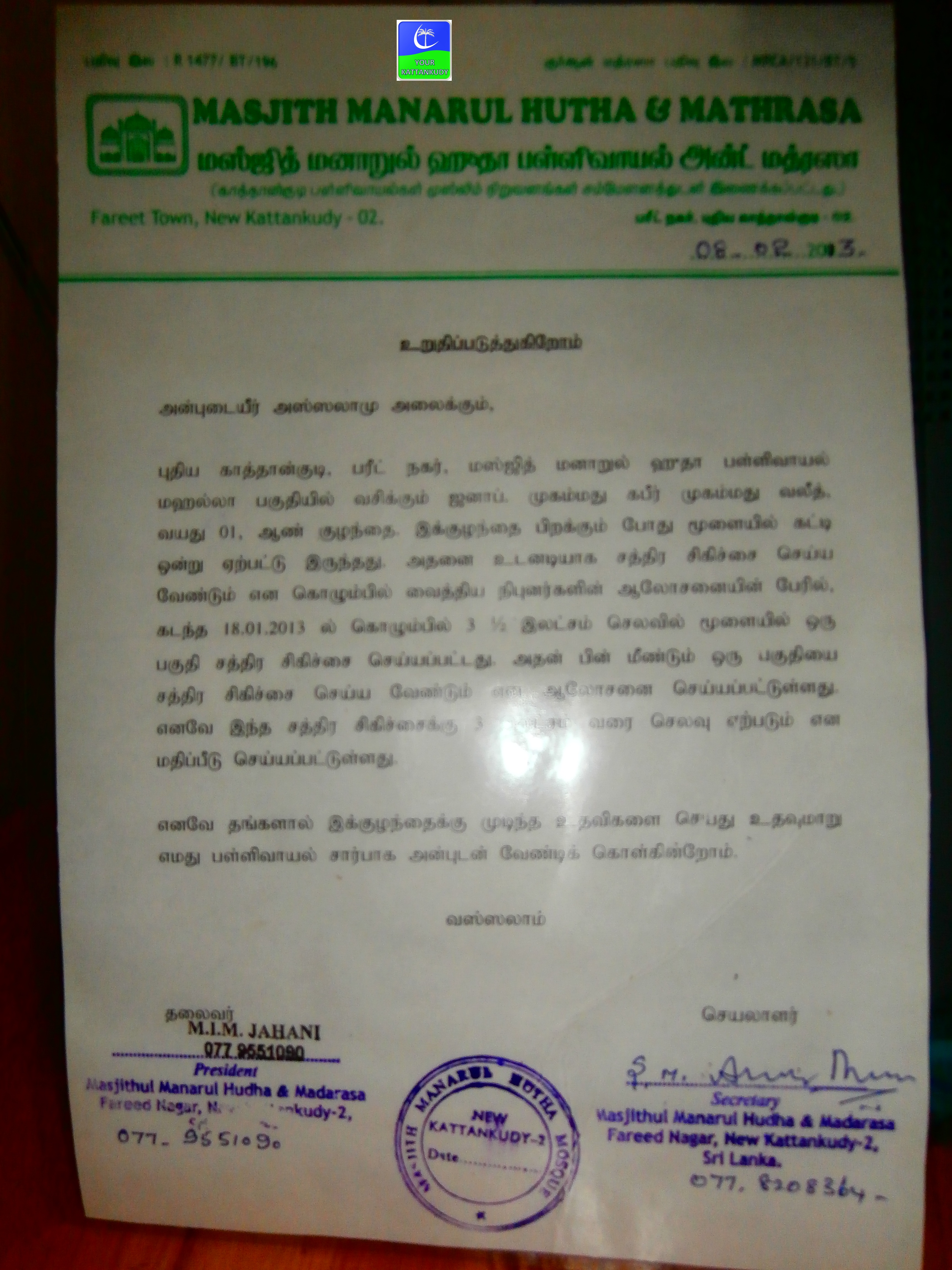 மஹல்லா பள்ளிவாயலினால் வழங்கப்பட்ட கடிதம்.