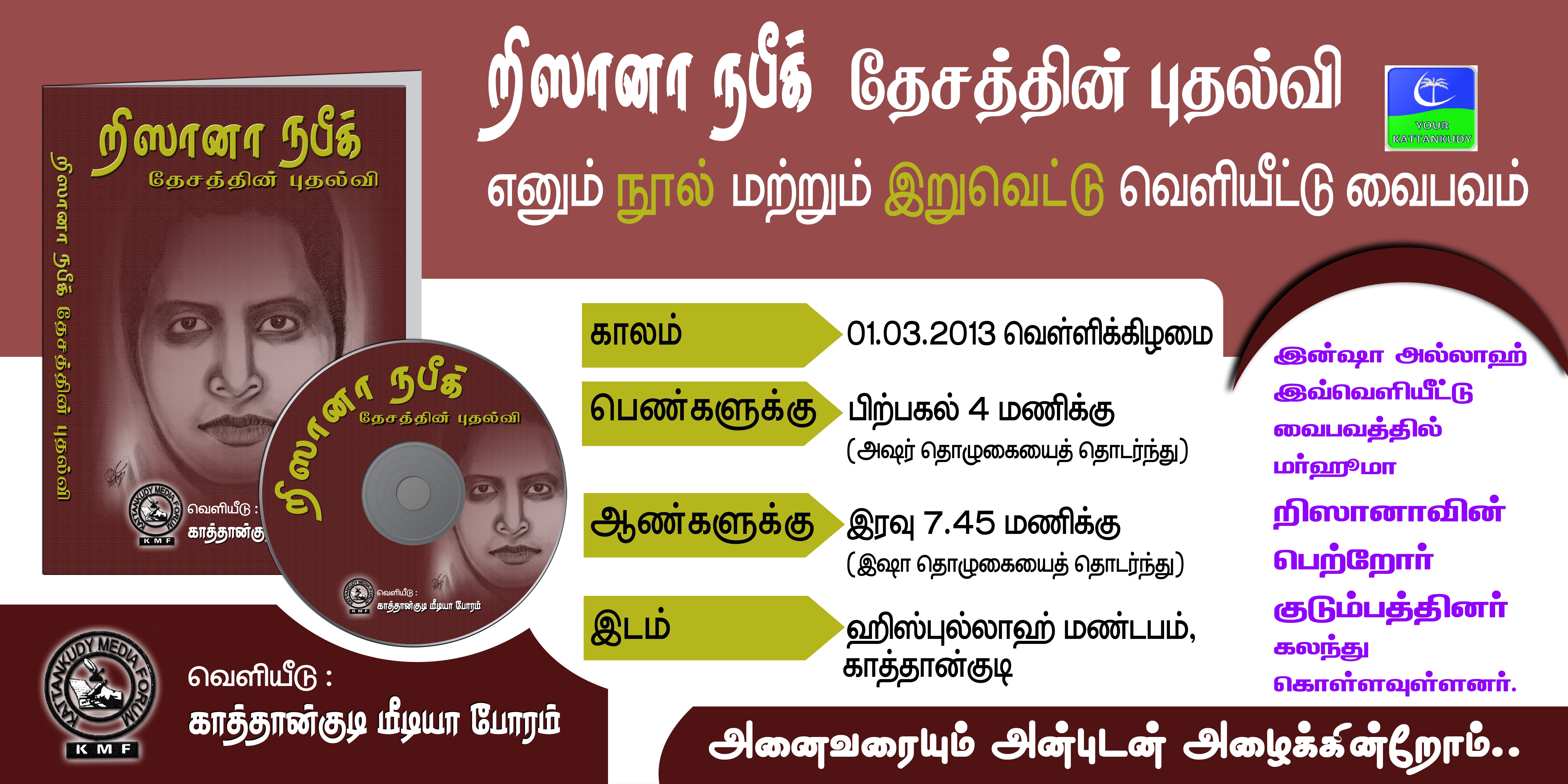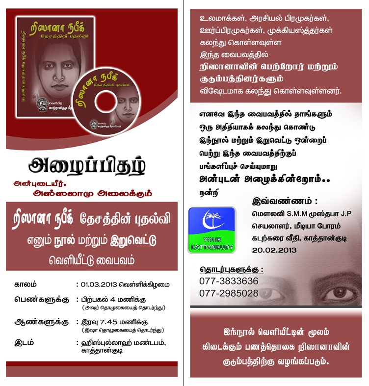 இந்நிகழ்வு எதிர்வரும் 01-03-2013 வெள்ளிக்கிழமை அஸர் தொழுகைகையத் தொடர்ந்து காத்தான்குடி ஹிஸ்புல்லாஹ் கலாசார மண்டபத்தில் நடைபெறும்.