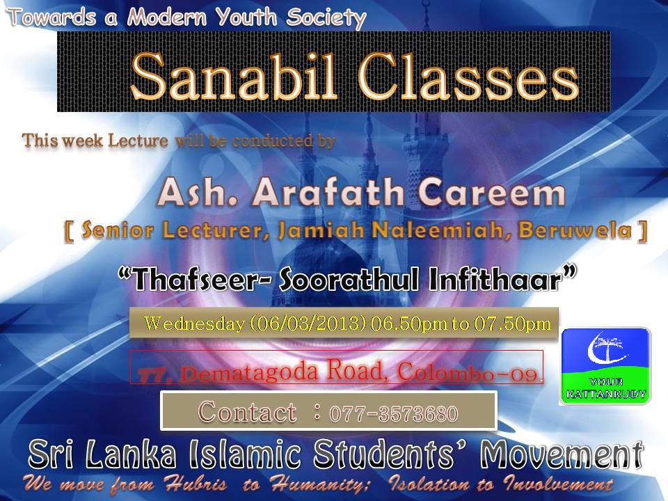 ஸ்ரீ லங்கா இஸ்லாமிய மாணவர் அமைப்பின் ஏற்பாட்டில் பிரதி புதன்கிழமை தோறும் மாலை 7.00 மணி முதல் 8.00 மணி வரை மிகச்சிறந்த வளவாளர்களினால் மிகச்சிறந்த தலைப்புக்களில் தொடர்ந்தும் வாராந்த நிகழ்ச்சி இடம்பெற்று வருகின்றது. அல்ஹம்துலில்லாஹ்.