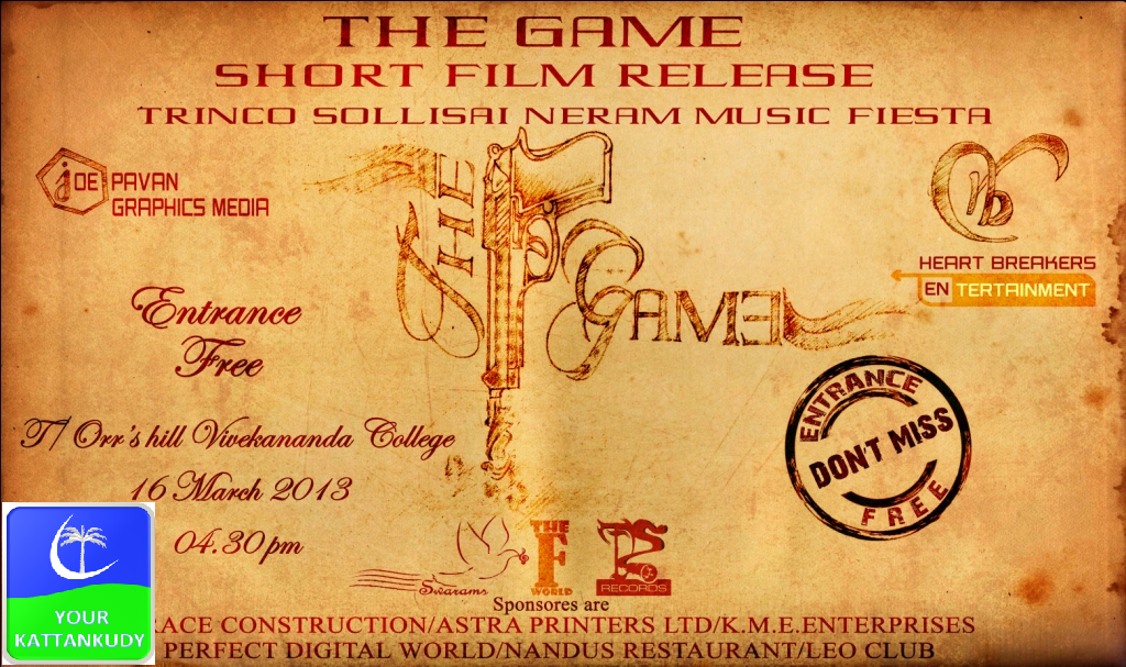 திருகோணமலை இளம் கலைஞர்கள் ஒன்று சேர்ந்து ‘The Game’ எனும் குறும்படத்தின் இசை வெளியீடு இசை நிகழ்வுகளுடன் எதிர்வரும் 16.03.2013 சனிக்கிழமை மாலை 04.30 மணிக்கு உவர்மலை விவேகானந்தா கல்லூரி கலைக்கூடத்தில் நடைபெறவுள்ளது.