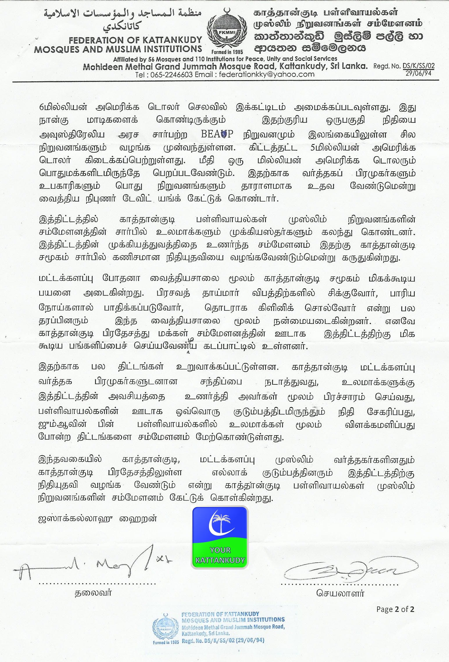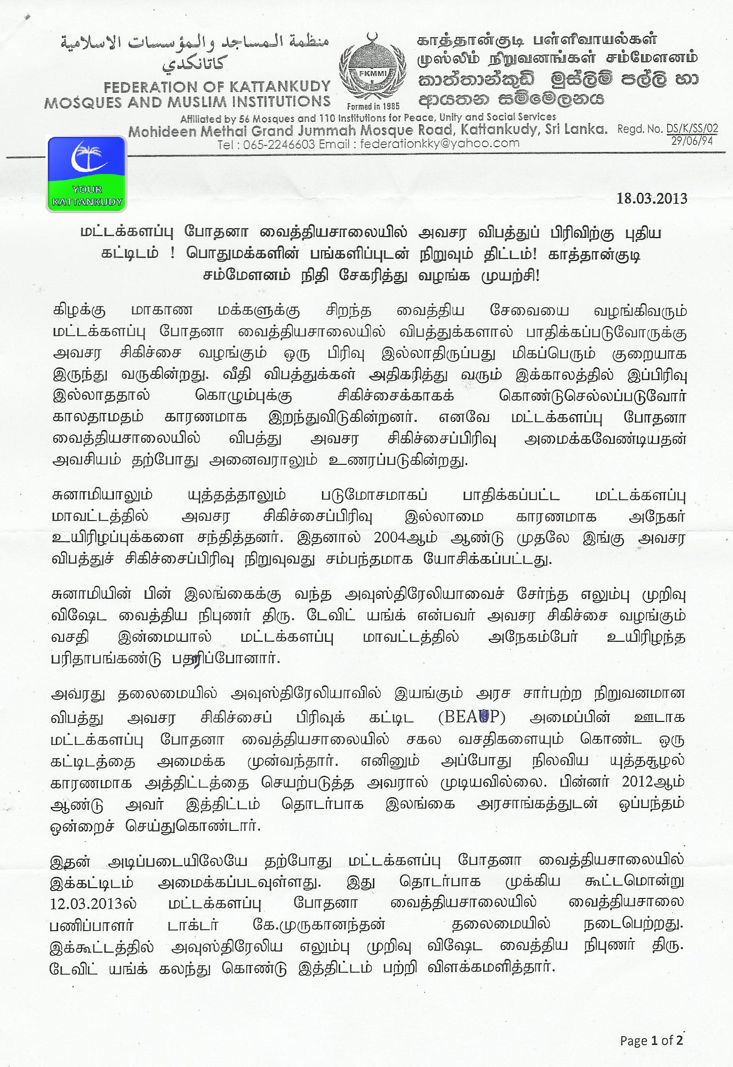 இவ் அவசர விபத்து பிரிவு அமைக்க மொத்தம் 20 கோடி ரூபாய் நிதி தேவைப்படுகின்ற நிலையில் 18 கோடி ரூபா வெளிநாட்டிலுள்ள அரச சார்பற்ற நிறுவனங்களால் வழங்கப்பட்டுள்ளதுடன் மிகுதியாக 2 இரண்டு கோடி ரூபா பணம் மட்டக்களப்பு மாவட்டத்திலுள் தமிழ்-முஸ்லிம் மக்களிடம் இருந்து ஏதிர்பார்க்கப்டுகின்றது இதில் காத்தான்குடி பிரதேசத்திலுள்ள முஸ்லிம் மக்களிடம் இருந்து காத்தான்குடி பள்ளிவாயல்கள் முஸ்லிம் நிறுவனங்களின் சம்மேளனத்தினால்; 50 ஐப்பது இலட்சம் ரூபா நிதி சேகரித்து வழங்க முயற்சிகள் இடம்பெற்று வருகின்றமை குறிப்பிடத்தக்கது.