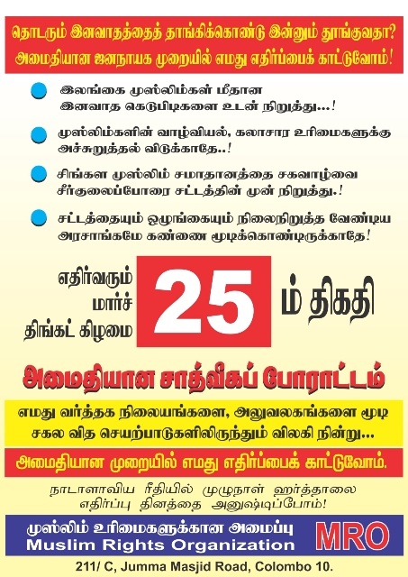 கொழும்பை மையமாகக் கொண்டு இயங்கும் முஸ்லிம் உரிமைகள் அமைப்பு (எம்.ஆர்.ஓ)இந்த அழைப்பை விடுத்துள்ளது.
