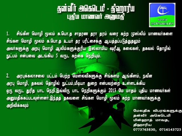 இலங்கையில் சிங்கள மொழியில் இஸ்லாமிய ஷரீஆக் கலைகளை கற்பிக்கும் திஹாரிய தன்வீர் எகடெமி புதிய மாணவர் அனுமதிக்கான விண்ணப்பங்களைக் கோரியுள்ளது.