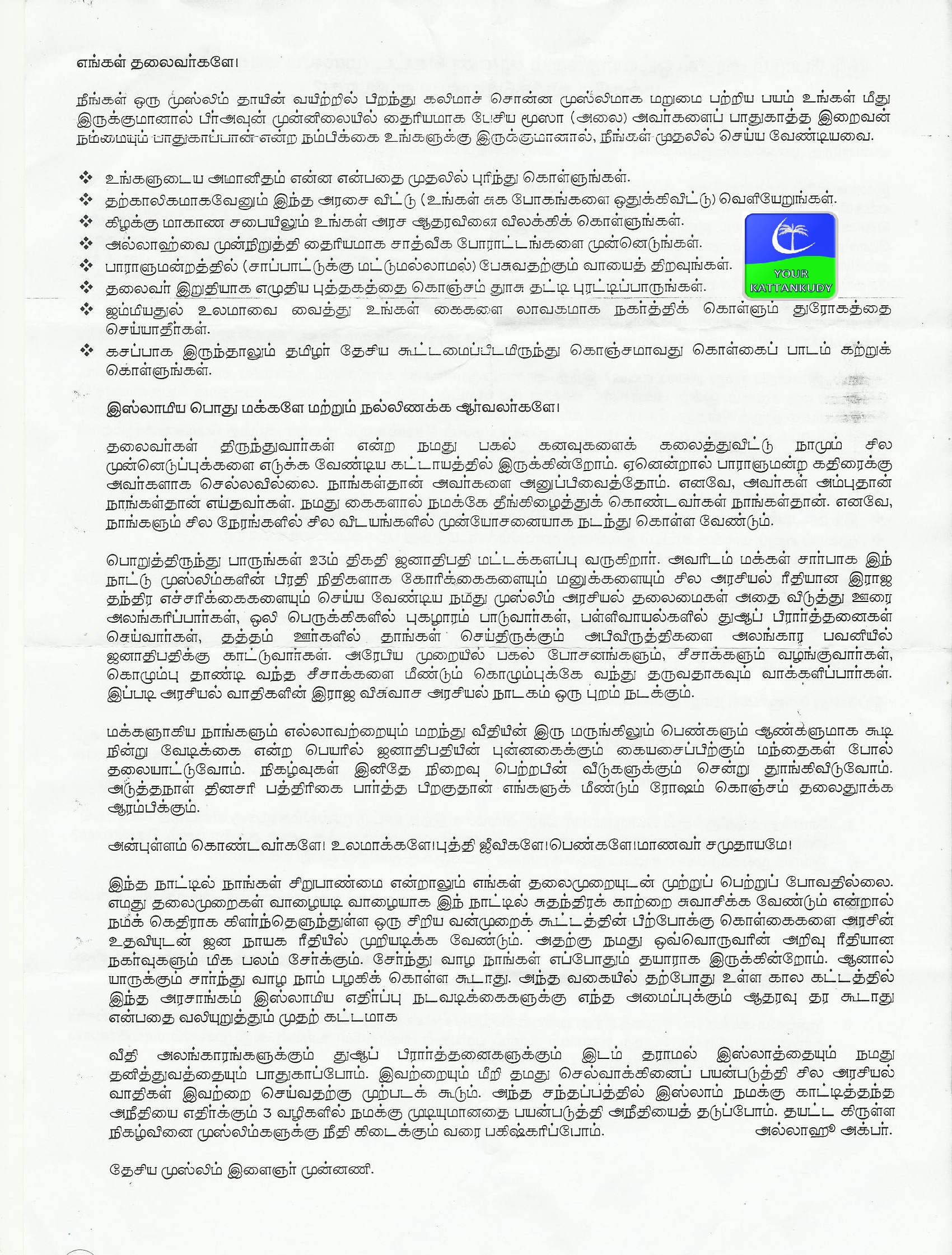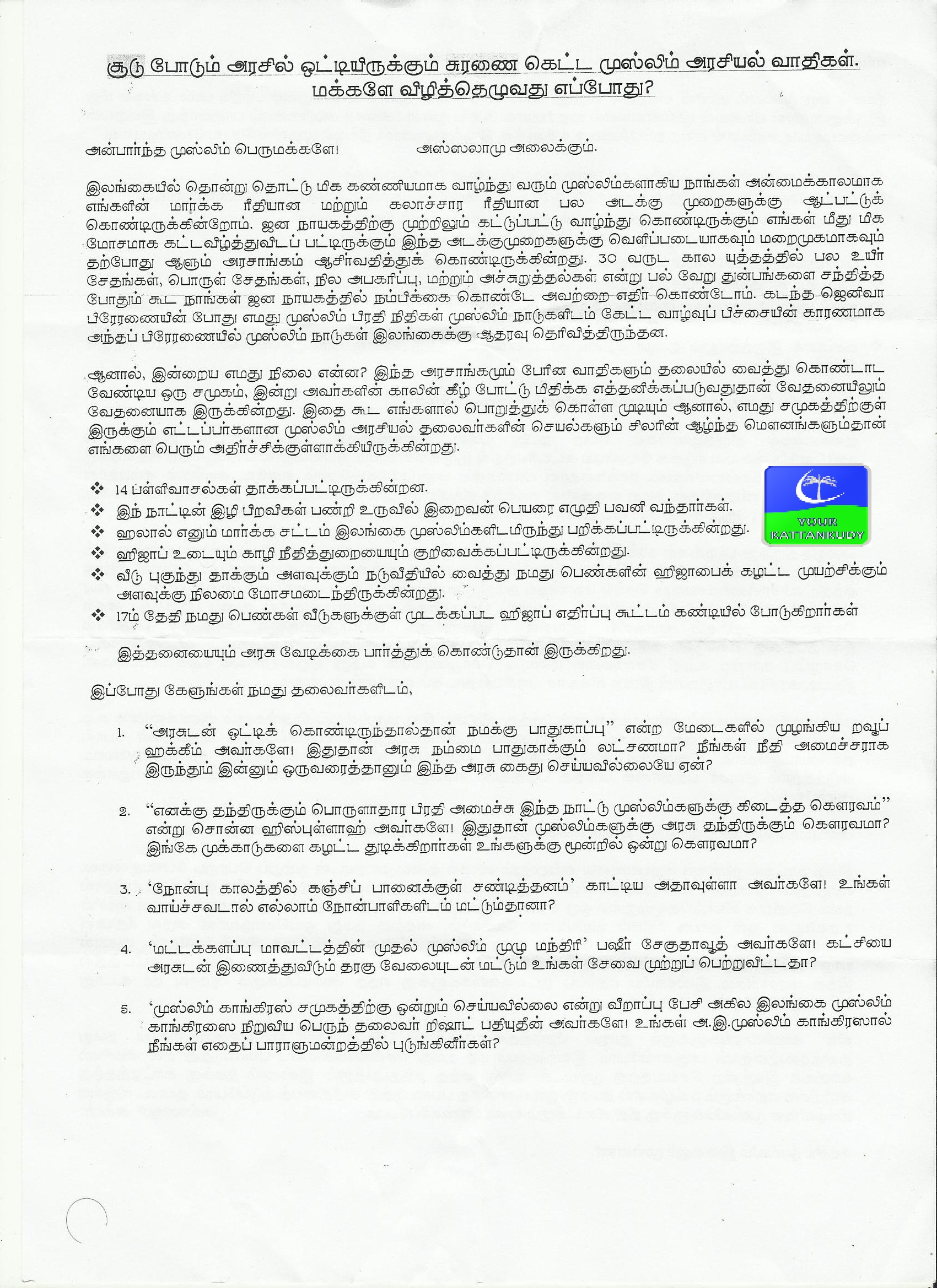 நாட்டில் முஸ்லிம்களுக்கு எதிராக மேற்கொள்ளப்பட்டுவரும் பேரினவாதத்தின் அச்றுறுத்தல்களுக்கு எதிராக இலங்கையின் பல பாகங்களிலும் முஸ்லிம்கள் எதிர்ப்பப் பேரணியை நடாத்த தீர்மானித்திருக்கின்றனர். இந்நிலையில் இன்று கிழக்கில் வெளியான துண்டுப்பிரசுரம் இங்கு பிரசுரிக்கப்படுகிறது.