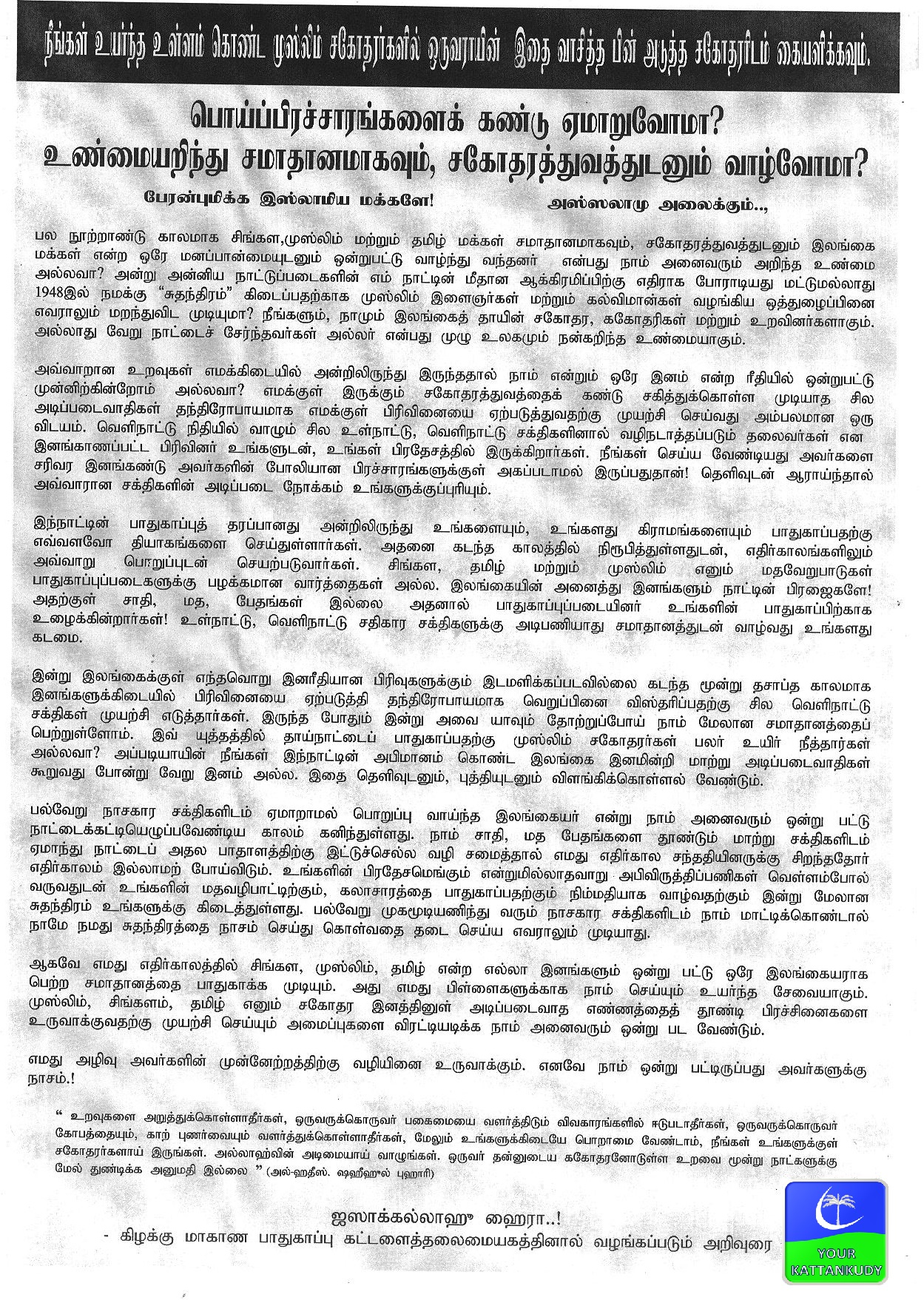 பொய்ப்பிரச்சாரங்களைக் கண்டு ஏமாறுவோமா? உண்மையறிந்து சமாதானமாகவும், சகோதரத்துவத்துடனும் வாழ்வோமா? எனும் தலைப்பில் கிழக்கு மாகாண பாதுகாப்புக் கட்டளைத் தலைமையகத்தினால் முஸ்லிம்களுக்கு விடுக்கப்பட்டுள்ள அறிவுரையில் குறிப்பிடப்பட்டுள்ளது.