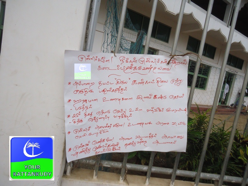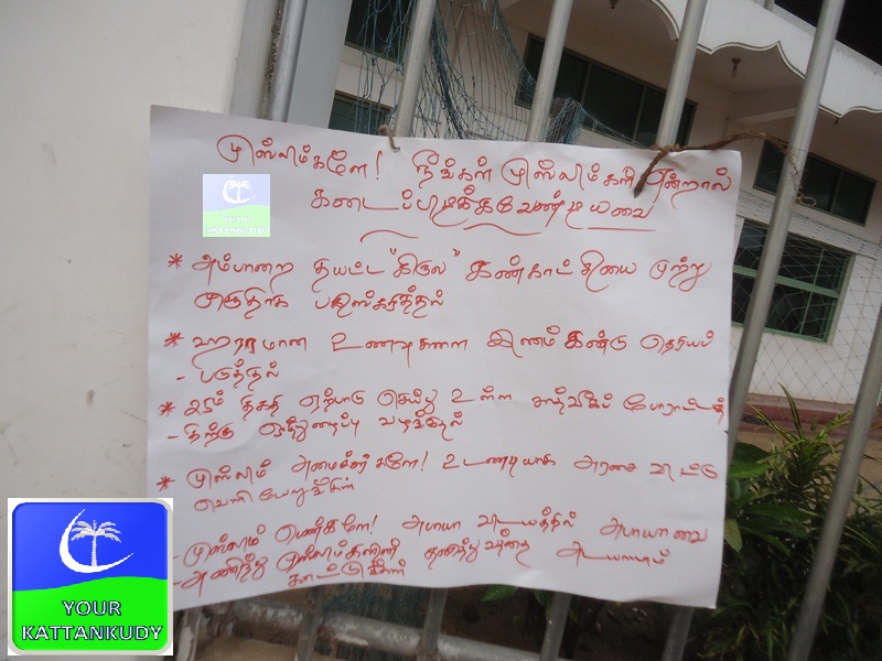 மட்டக்களப்பு புதிய காத்தான்குடி நூராணியா பள்ளிவாயலை அண்டிய பகுதிகளில் இக்காலகட்டத்தில் ‘முஸ்லிம்களே! நீங்கள் முஸ்லிம்கள் என்றால் கடைப்பிடிக்க வேண்டியவை” எனும் தலைப்பில் சுவரொட்டிகள் ஒட்டப்பட்டுள்ளன.