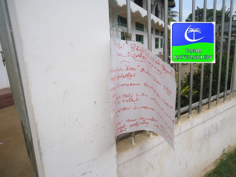 நேற்று வியாழக்கிழமை நள்ளிரவிலேயே இந்த சுவரொட்டிகள் ஒட்டப்பட்டிருக்கும் என அப்பகுதி மக்கள் தெரிவிக்கின்றனர்.