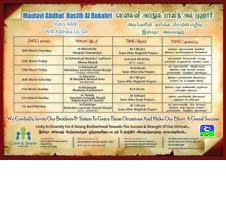 29.03.2013 வெள்ளிக்கிழமை இஷாத் தொழுகையினைத் தொடா்ந்து “நம் ஸஹாபாக்களின் வீரத்தியாகமும் இன்றைய எமது சமூகமும் நாளைய முஸ்லிம்களின் வெற்றியை நோக்கியதா”…? எனும் தலைப்பினில் காத்தான்குடி 03 மெத்தை பெரிய ஜூம்ஆ பள்ளிவாயலில் சொற்பொழிவாற்ற உள்ளார்கள்.