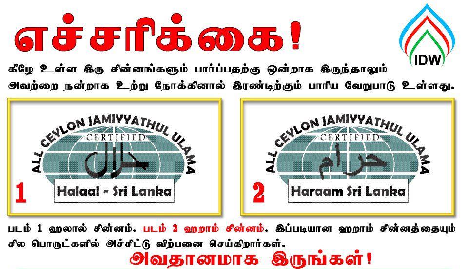 முதலாவது படத்தில் ஹலால் சின்னமும் (Halal Logo) இரண்டாவது படத்தில் ஹறாம் சின்னமும்; (Haraam Logo) காணப்படுகிறது.