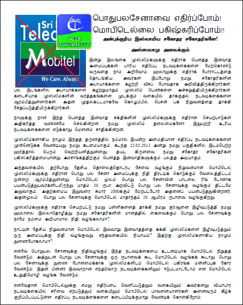 காத்தான்குடி: பொதுபலசேனாவை ஏதிர்ப்போம்-மொபிடெல்லை பகிஸ்கரிப்போம் எனும் தலைப்பில் காத்தான்குடி நீதிக்கான மக்கள் குரல் இயக்கத்தினால் இரண்டு பக்கத்தில் ஒரு துண்டுப்பிரசுரம் ஒன்று காத்தான்குடியில் வெளியிடப்பட்டுள்ளது. வெளியிடப்பட்ட துண்டுபிரசுரத்தில் குறிப்பிட்டுள்ள விடயங்கள் பின்வறுமாறு
