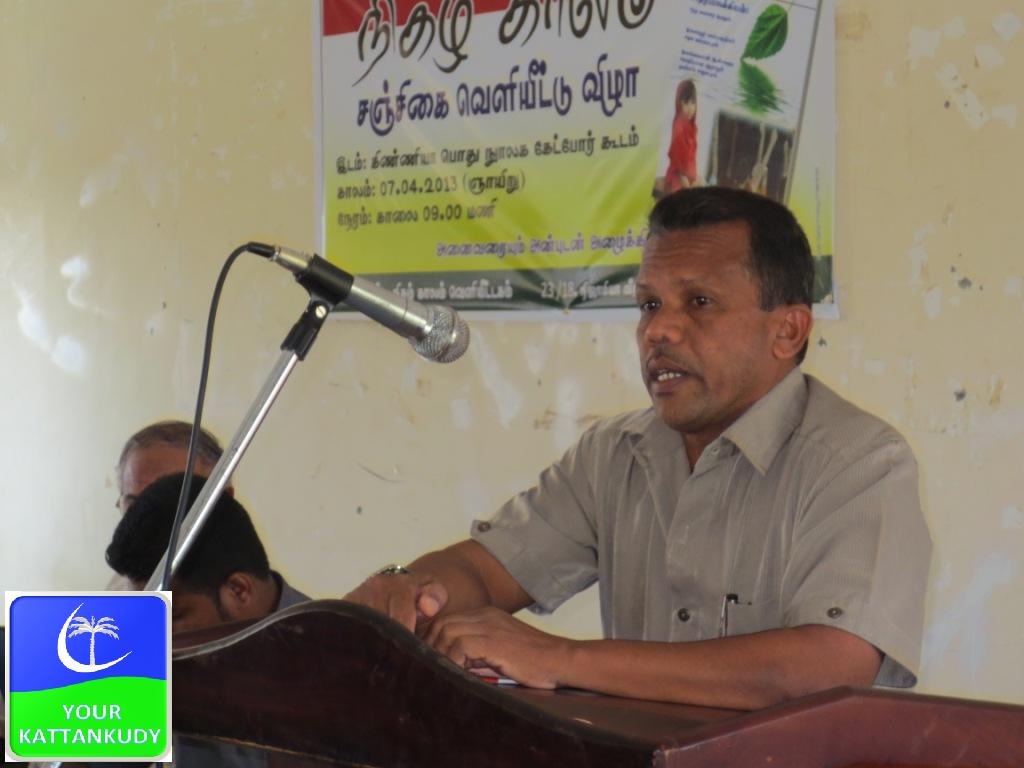 கிண்ணியா: திருகோணமலை கிண்ணியா அஷ்ஷெய்ஹ் நாஸிக் மஜீத் (நளீமி)யை பிரதம ஆசிரியராகக் கொண்டுவெளிவரும் ‘ நிகழ் காலம் ‘ காலாண்டு சஞ்சிகை வெளியீட்டு நிகழ்வு 07.04.2013 ஞாயிற்றுக்கிழமைகாலை கிண்ணியா பொது நூலக கோட்போர் கூடத்தில் இடம்பெற்றது.