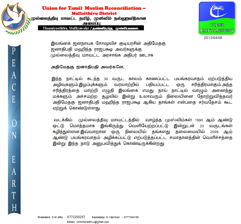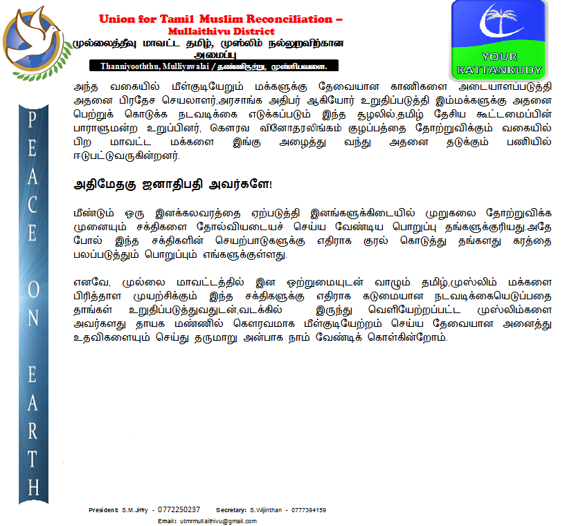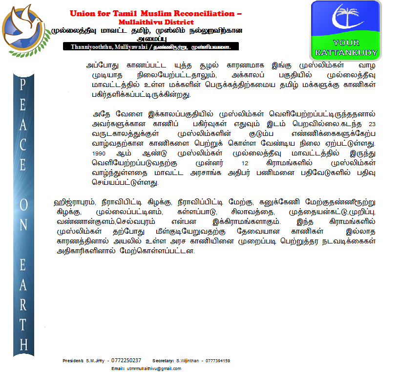 முல்லைத்தீவு மாவட்ட தமிழ், முஸ்லிம் நல்லுறவிற்கான அமைப்பு இன்று காலை ஜனாதிபதிக்கு கையளிக்கப்பட்ட அறிக்கை இங்கு இணைக்கப்பட்டிருக்கின்றது.