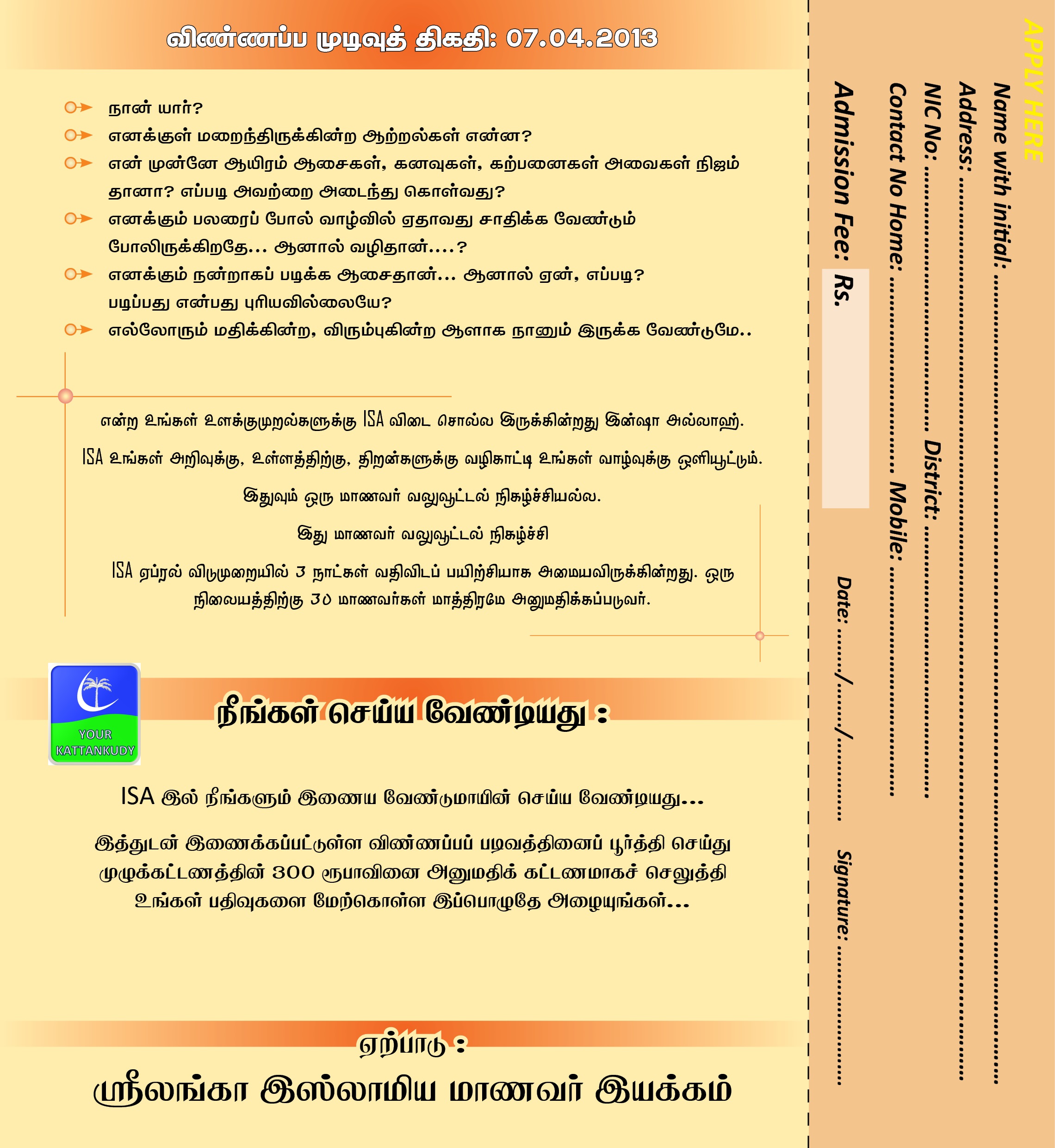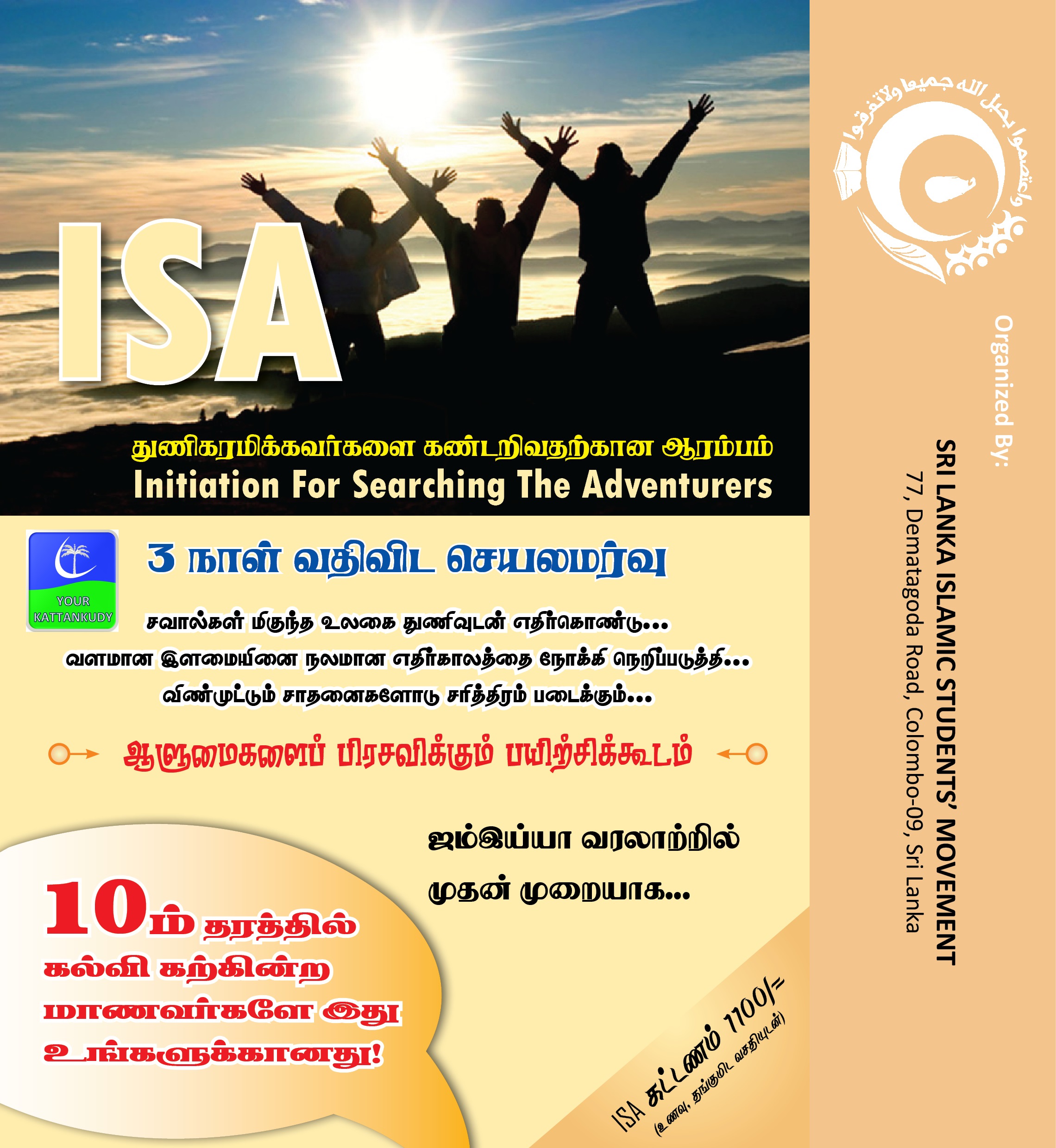 கொழும்பு: ஸ்ரீ லங்கா இஸ்லாமிய மாணவர் இயக்கத்தின் (ஜம்மிய்யா) ஏற்பாட்டில் இவ்வருடம் தரம் 10 இல் கல்வி பயிலும் மாணவர் கலுக்கான INITIATION FOR SEARCHING THE ADVENTURERS (I.S.A.) துணிகரமிக்கவர்களை கண்டறிவதற்கான ஆரம்பம் பயிற்சிநெறி எதிர்வரும் 14, 15, 16 ஆகிய தினங்களில் கிழக்கு மாகாண மாணவர்களுக்கு நடைபெற இருக்கின்றது.