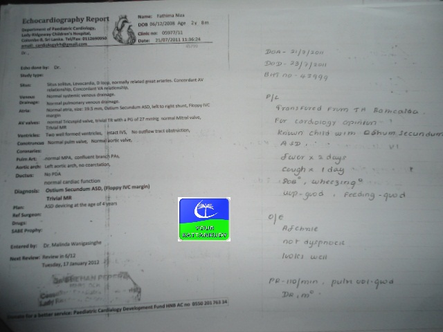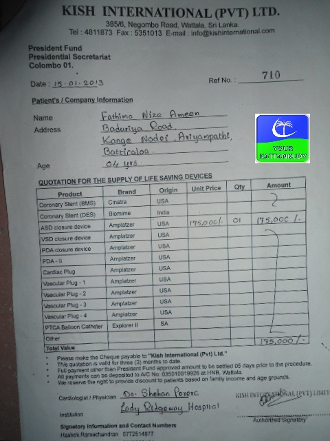 காத்தான்குடி: காத்தான்குடியின் அயல் கிராமமான காங்யேனோடை பதுர் பள்ளி வீதியில் வதியும் அமீன் ஸா்மிலா என்வா்களுக்கு மூன்றாவது மகளாகப் பிறந்த பாத்திமா நிஷா, பிறந்து நான்கு வருடங்கள் மாத்திரம் ஆரோக்கியமாக வாழ்ந்து வந்த இந்த ஏழை சிறுமி, தற்போது 5 வயதினை அடைந்த நிலையில் இதயத்தில் ஏற்பட்ட பாரிய நோய் காரணமாக வைத்தியம் செய்ய வசதியின்றி உயிருக்காகப் போராடிக் கொண்டிருக்கின்றார்.