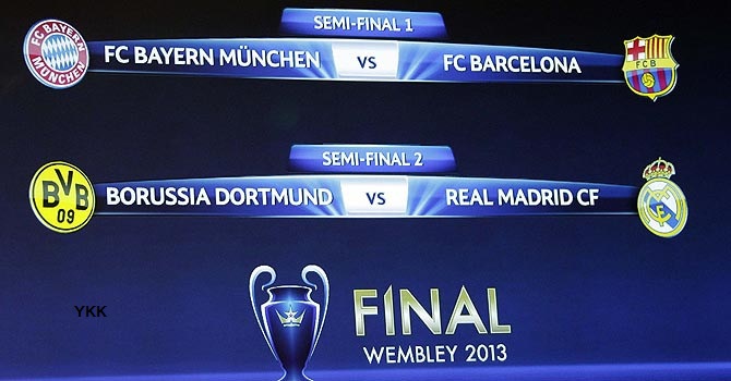கடந்த வாரம் இடம்பெற்று முடிந்த கால் இறுதிப்போட்டியில் வெற்றி பெற்ற ரியல் மெட்ரிட் (ஸ்பெய்ன்), பார்சிலோனா (ஸ்பெய்ன்), பேயர்ன் மியூனிச் (ஜேர்மனி) மற்றும் பொரஸ்ஸா டொட்மண்ட் (ஜேர்மனி) ஆகிய அணிகளுக்கிடையிலான அரை இறுதிப்போட்டியின் குலுக்கள் (Draw) முறையிலான தெரிவு சற்று முன்னர் இடம்பெற்றது.