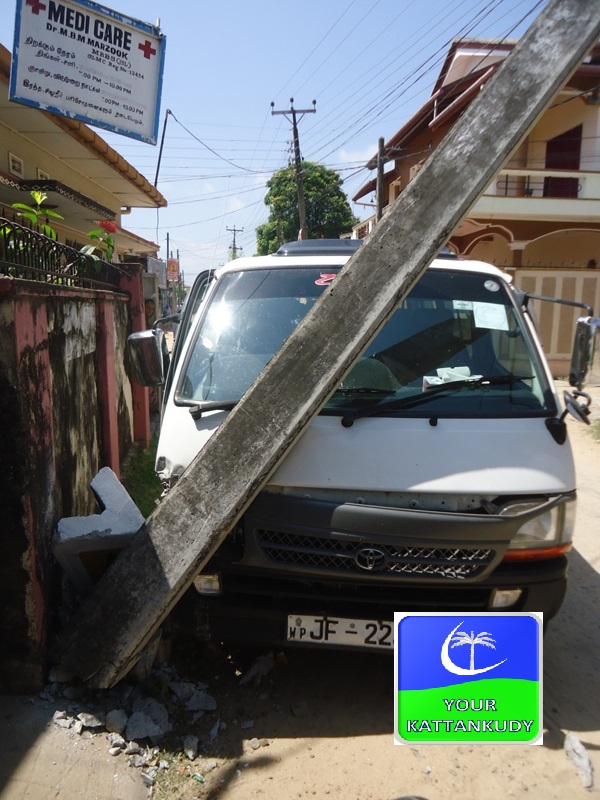 காத்தான்குடி: பழைய கல்முனை ஊர் வீதியில் காத்தான்குடி ஹிழ்றியா வித்தியாலயத்திற்கு அருகாமையில் வேன் ஒன்று இன்று திங்கட்கிழமை காலை சற்று நேரத்துக்கு முன்னர் மின்சார சபையின் மின் கம்பத்தில் மோதி விபத்துக்குள்ளானது.