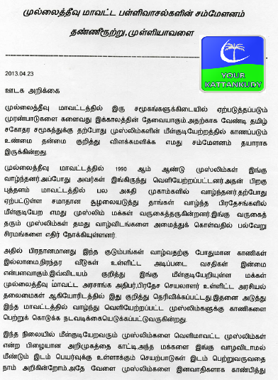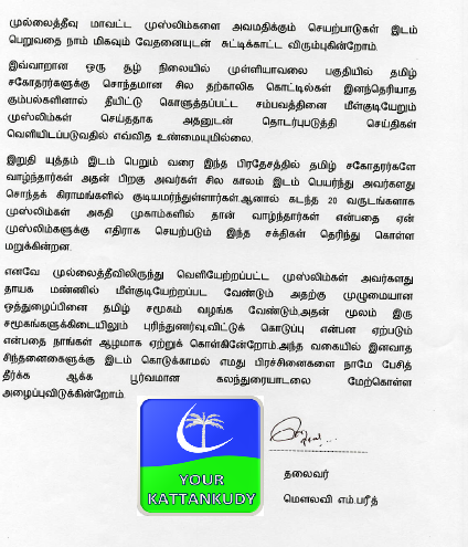 முல்லைத்தீவு: முல்லைத்தீவு மாவட்டத்தின் நிலை குறித்து முல்லைத்தீவு மாவட்ட பள்ளிவாசல்களின் சம்மேளனம் இன்று ஊடகங்களுக்கு அறிக்கையொன்றை வெளியிட்டுள்ளது.அதனை இங்கு தருகின்றோம்.
