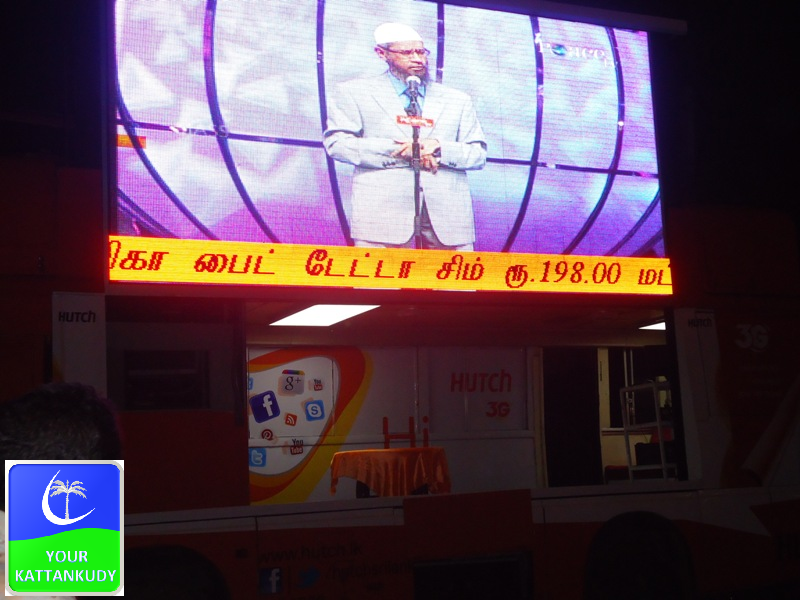 இன்று சனிக்கிழமை காத்தான்குடிப் பிரதேசத்தில் ஆங்கிலத்தில் உலக பிரபல்யம் பெற்ற மார்க்க அறிஞரான டாக்டர் ஸாகிர் நாயக்கின் உரை புரஜக்டர் மூலம் விஷேட பயான் நிகழ்ச்சிகள் காத்தான்குடி பிரதான வீதி குர்ஆன் சதுக்கத்தில் ஒலிபரப்பு செய்யப்பட்டன.