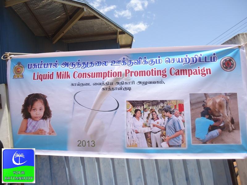 காத்தான்குடி: அரசாங்கத்தின் ‘பசும்பால் அருந்துதலை ஊக்குவிக்கும் விசேட செயற்றிட்டத்தின்’ கீழ் மட்டக்களப்பு காத்தான்குடி கால்நடை வைத்திய அதிகாரி அலுவலகத்தினால் ஏற்பாடு செய்யப்பட்ட மக்களுக்கிடையில் பசும்பால் அருந்துதலை ஊக்குவிக்கும் செயற்றிட்டம் இன்று வியாழக்கிழமை புதிய காத்தான்குடி பதுறியா சமூக சேவை நிலையத்தில் காத்தான்குடி கால்நடை வைத்திய அதிகாரி அலுவலகப் பொறுப்பாளர் ஸலீம் தலைமையில் நடைபெற்றது.