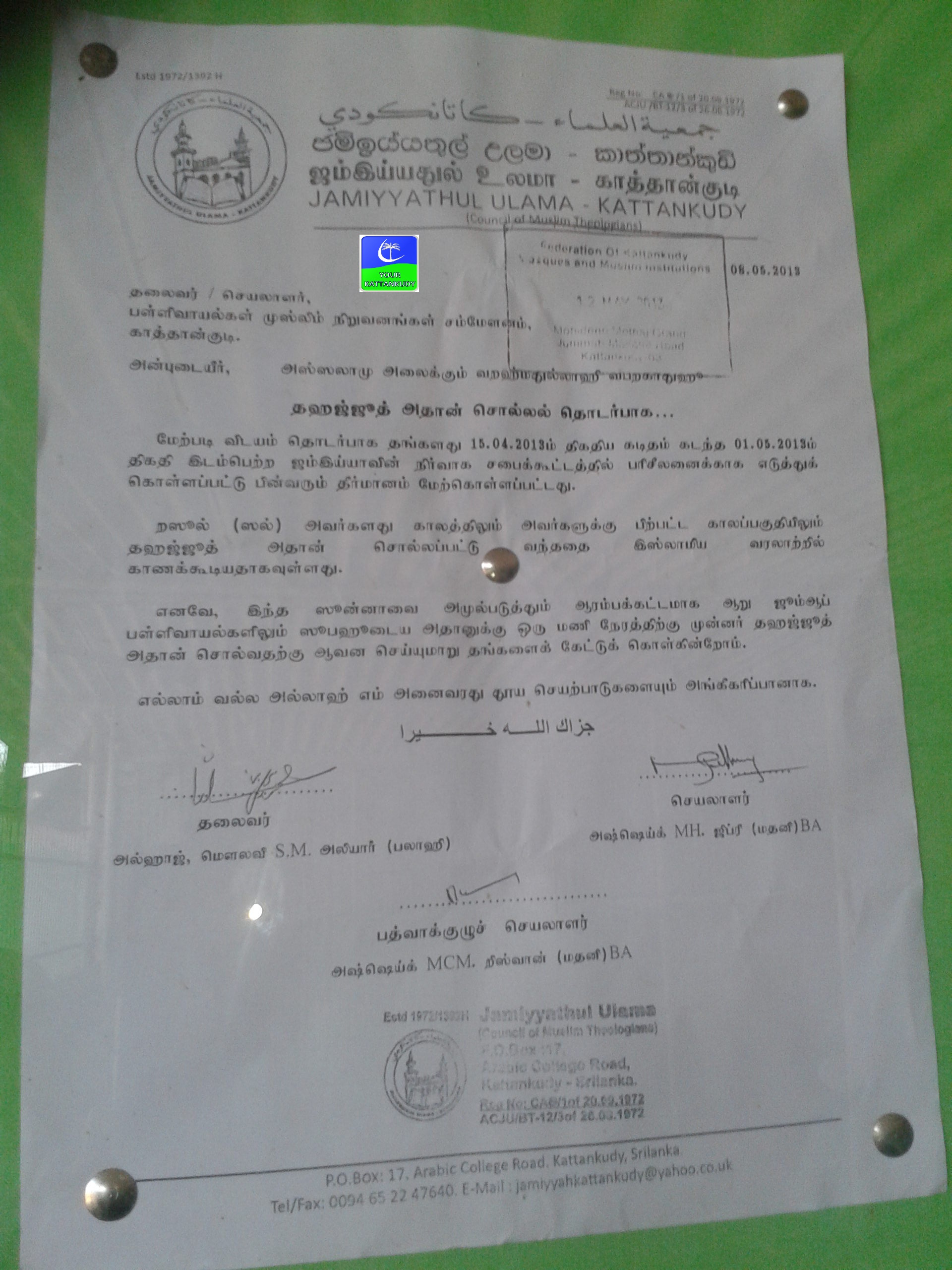 காத்தான்குடி: காத்தான்குடி பள்ளிவாயல்கள் முஸ்லிம் நிறுவனங்களின் சம்மேளனம், காத்தானகுடி ஜம்மியதுல் உலமா சபை ஆகியவற்றின் ஒருமித்தான தீர்மானத்தின் அடிப்படையில் காத்தான்குடியில் அமைந்துள்ள ஆறு ஜூம்ஆ பள்ளிவாயல்களிலும் இன்று முதல் தஹஜ்ஜூத் தொழுகைக்காக ‘அதான்’ சொல்லப்படவுள்ளதாக அறிவிக்கப் பட்டுள்ளது.