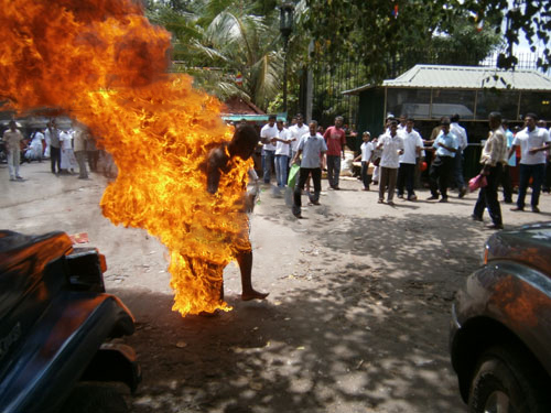 கண்டி: ஆடு, மாடுகள் கொல்லப்படுவதற்கு எதிர்ப்பு தெரிவித்தே இந்தப் பிக்கு தன்மீது பெற்றோலை ஊற்றி எரித்துக்கொண்டுள்ளார்.மோசமான எரிகாயங்களுக்கு உள்ளான அவரை அருகில் நின்றவர்கள் கண்டி மருத்துவமனையில் சேர்த்துள்ளனர்.