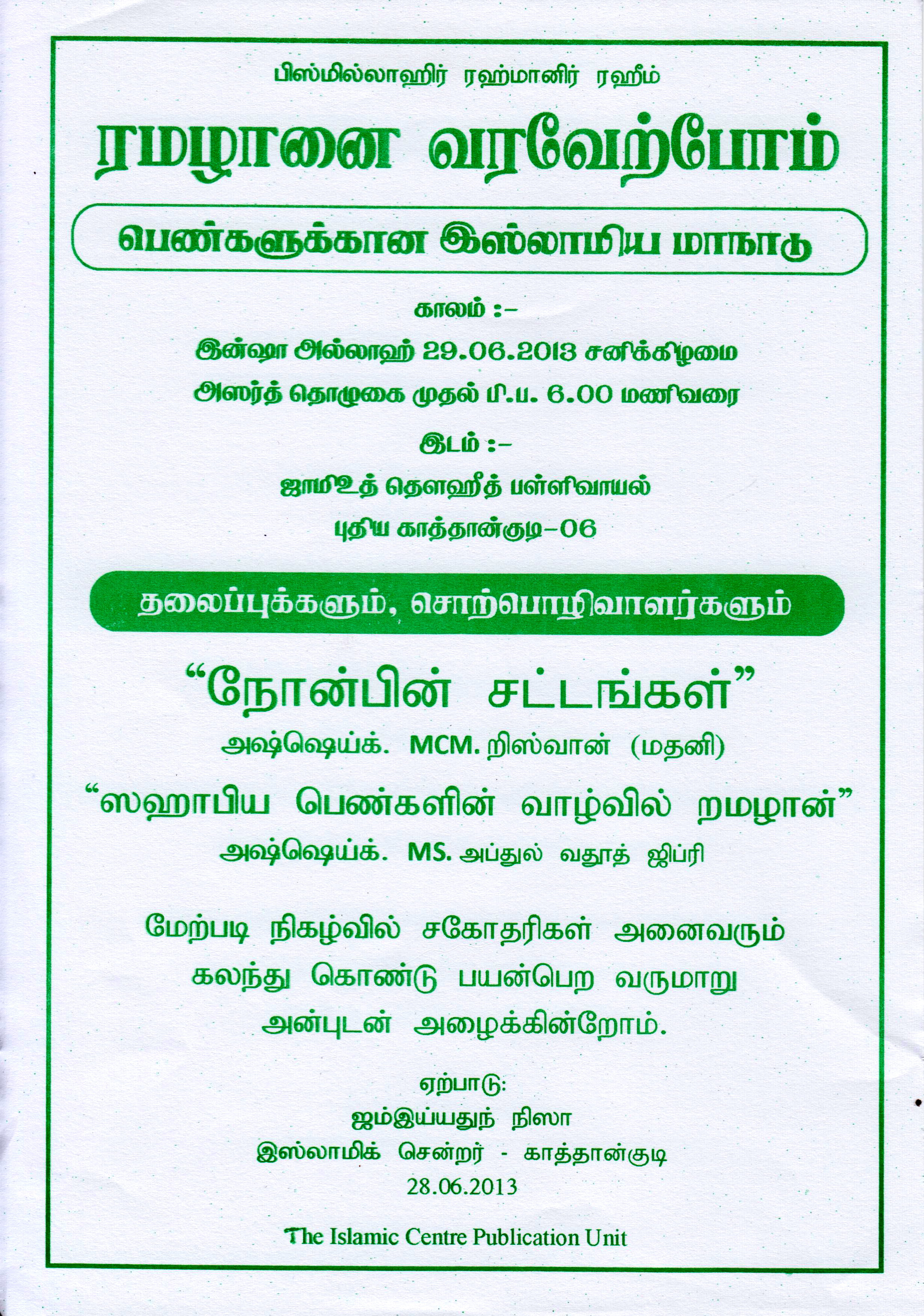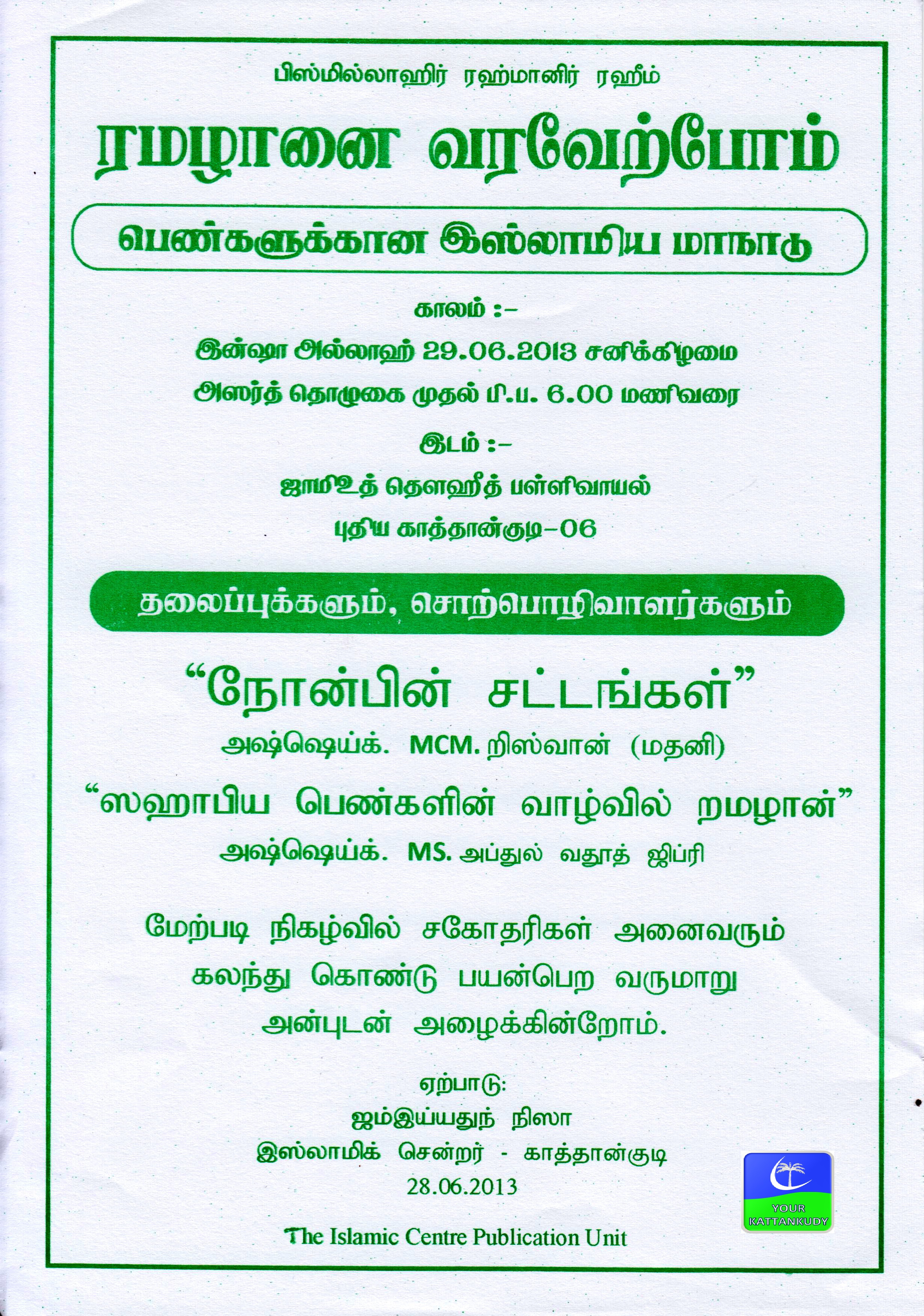 இன்ஷா அல்லாஹ் 29.06.2013 சனிக்கிழமை அஸர்த் தொழுகையைத் தொடர்ந்து பி.ப. 6.00 மணிவரை புதிய காத்தான்குடி-06, ஜாமிஉத் தௌஹீத் ஜும்ஆபள்ளிவாயலில் நடாத்துவதற்கு ஏற்பாடு செய்யப்பட்டுள்ளது.