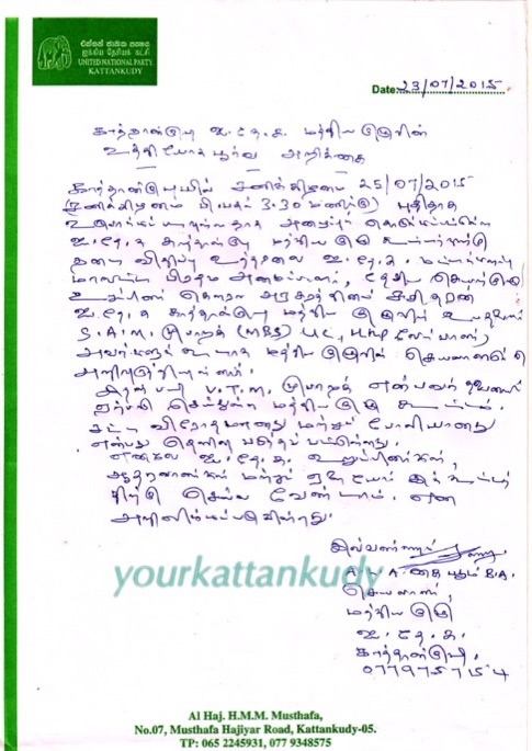 காத்தான்குடியில் 25.07.2015 சனிக்கிழமை பி.பகல். 3:30 மணிக்கு புதிதாக உருவாக்கப்படவுள்ளதாக அழைப்புக் கொடுக்கப்பட்டுள்ள ஐ.தே.க. காத்தான்குடி மத்திய குழுக் கூட்டத்திற்கு தடை விதிப்பு உத்தரவை ஐ.தே.க. மட்டக்களப்பு மாவட்டபிரதம அமமைப்பாளர், தேசிய செயற்குழு உறுப்பினர் கௌரவ அரசரத்தினம் சசிதரன், ஐ.தே.க. காத்தான்குடி மத்திய குழுவின் உபதலைவர் எஸ.ஏ.எம். முபாறக் (MBS) UC UNP வேட்பாளர் அவர்களுடாக மத்திய குழுவின் செயலாளருக்கு அறிவுறுத்தியுள்ளார்.