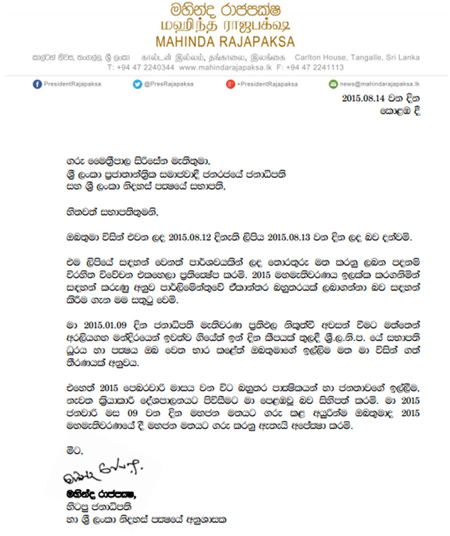 கொழும்பு: நான் 2015 ஜனவரி 9 ஆம் திகதி மக்கள் ஆணைக்கு மதிப்பளித்தது போல நீங்களும் 2015 பொதுத் தேர்தலில் மக்கள் ஆணைக்கு மதிப்பளிப்பீர்கள் என எதிர்பார்க்கிறேன் என்று குருநாகல் மாவட்ட வேட்பாளர் மஹிந்த ராஜபக்ஷ ஜனாதிபதி மைத்திரிபால சிறிசேனவுக்கு பதில் கடிதம் ஒன்றினை அனுப்பியுள்ளார். ஜனாதிபதி மைத்திரிபால சிறிசேன மஹிந்த ராஜபக்ஷவிற்கு நேற்று அவசர கடிதம் ஒன்றினை அனுப்பி இருந்தார்.அந்த கடிதத்திற்கு பதில் கடிதம் ஒன்றினை மஹிந்த ராஜபக்ஷ இன்று அனுப்பியுள்ளார்.