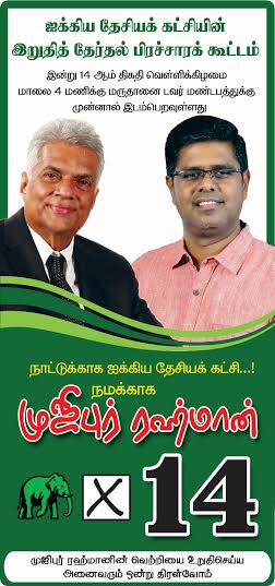 கொழும்பு: மத்திய கொழும்பு ஐக்கிய தேசியக்கட்சி பிரதான அமைப்பாளரும் வேட்பாளருமான முஜிபுர் ரஹ்மானை ஆதரித்து பிரதமர் ரணில் விக்கிரம சிங்க கலந்துகொள்ளும் இறுதித் தேர்தல் பிரச்சாரக் கூட்டம் இன்று வெள்ளிக்கிழமை மாலை 4 மணிக்கு கொழும்பு 10 டவர் மண்டபத்துக்கு முன்பாக இடம்பெறவுள்ளது. முஜிபுர் ரஹ்மானை ஆதரித்து இடம்பெரும் இந்த மாபெரும் இறுதித் தேர்தல் பிரச்சாரக்கூட்டமானது பிரதமர் ரணில் விக்கிரம சிங்க வேட்பாளர்களை ஆதரித்து கலந்துகொள்ளும் 146 பெரிய கூட்டமாகும்.