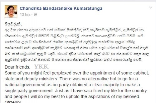 தனிக்கட்சிக்கு ஆட்சியை அமைப்பதற்கு சந்தர்ப்பம் இல்லாததினால் இப்படியான மாற்றுவழிகளை செய்ய வேண்டிய நிர்ப்பந்தத்தில் தேசிய அரசாங்கம் உள்ளதாகவும் அவர் கூறியுள்ளார். இதேவேளை ஜனவரி 8ஆம் திகதி மேற்கொண்டதைப் போன்று எதிர்காலத்திலும் தனது அளப்பரிய சேவையை நாட்டு மக்களுக்கு வழங்க தயாராக இருப்பதாக முன்னாள் ஜனாதிபதி சந்திரிகா குமாரதுங்க மேலும் குறிப்பிட்டுள்ளார்.