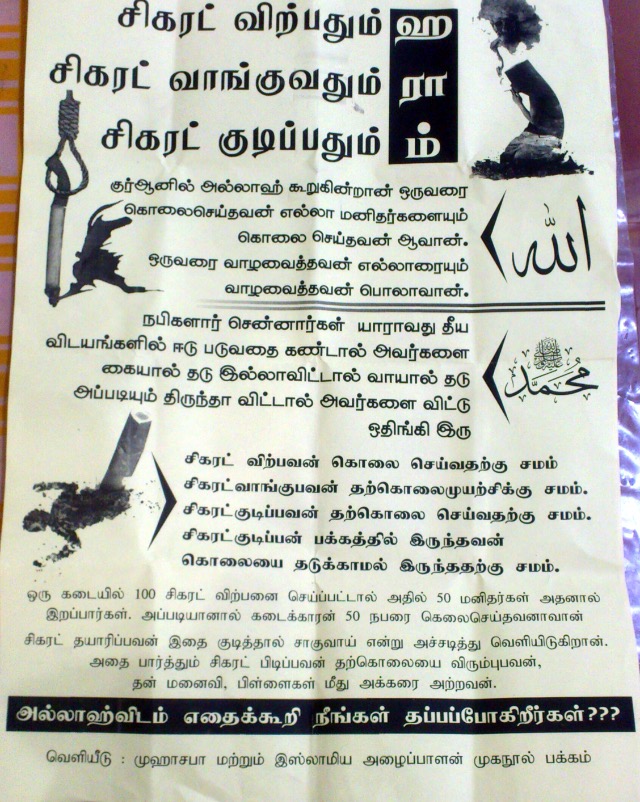 “சிகரட் விற்பதும், வாங்குவதும், குடிப்பதும் ஹராம்” காத்தான்குடியில் சுவரொட்டிகள்
