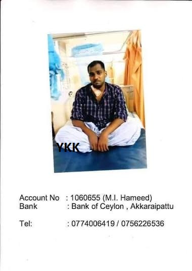 தற்பொழுது இரண்டு சிறுநீரகமும் செயலிழந்த நிலையில் கொழும்பு தேசிய வைத்தியசாலையில் நான்கு மாதமாக சிகிச்சை பெற்று வருகின்ற அட்டாளைச்சேனையைச் சேர்ந்த எம்.ஐ.ஹமீட் 26 வயது இளைஞருக்கு அவசரமாக சிறுநீரக மாற்று சத்திரசிகிச்சை செய்ய வேண்டும் என்று வைத்தியர்கள் கூறியுள்ளார்கள். இச் சத்திரசிகிச்சை செய்வதற்கு 300,0000 (முப்பது இலட்சம்) தேவைப்படுகிறது.