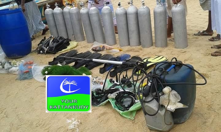 காத்தான்குடி: காத்தான்குடி கடலில் வர்ண மீன்பிடித் தொழிலில் ஈடுபடும் வாடிகளை கடற்றொழில் திணைகள அதிகாரிகள் 10.05.2016 செவ்வாய்க்கிழமை திடீர் பரிசோதனையை மேற்கொண்டனர். இதன்போது சட்ட விரோதமான முறையில் வர்ண மீன்களை பிடிப்பதற்காக பயன்படுத்தப்படும் சட்டவிரோத உபகரணங்கள், வலைகள், துப்பாக்கி, தங்கூசிப் பக்கட்டுகள், அளவுக்கதிகமான சிலின்டர்கள், ஈட்டியினால் குத்தி பிடிபட்ட மின் என்பவற்றை அதிகாரிகள் கைப்பற்றினர்.