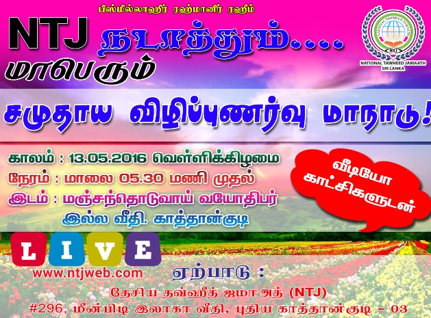 தேசிய தவ்ஹீத் ஜமாஅத் NTJயின் ஏற்பாட்டில் இன்ஷா அல்லாஹ் எதிர்வரும் (13.05.2016) வெள்ளிக்கிழமை காத்தான்குடி வயோதிபர் இல்ல வீதி, மஞ்சந்தொடுவாயில் மாபெரும் சமுதாய விழிப்புணர்வு மாநாடு!
