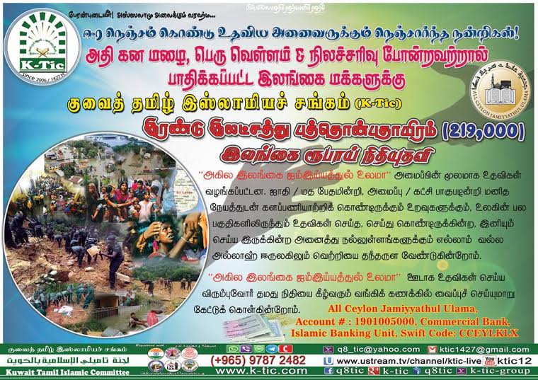 குவைத்: அதி கன மழை, பெரு வெள்ளம் & நிலச்சரிவு போன்றவற்றால் பாதிக்கப்பட்ட இலங்கை மக்களுக்கு… குவைத் தமிழ் இஸ்லாமியச் சங்கம் (K-Tic) இரண்டு இலட்சத்து பத்தொன்பதாயிரம் (219,000) இலங்கை ரூபாய் நிதியுதவி. *அகில இலங்கை ஜம்இய்யத்துல் உலமா* ஊடாக உதவிகள் செய்ய விரும்புவோர் தமது நிதியை கீழ்வரும் வங்கிக் கணக்கில் வைப்புச் செய்யுமாறு கேட்டுக் கொள்கின்றோம்.